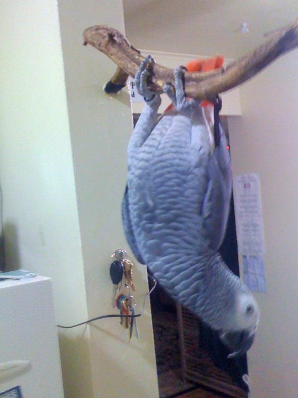 Cosmo has a game that he plays when he's on his kitchen perch. He'll wait until I (or anyone) walks under him and at the exact moment, he'll swing down, bopping you on the top of your head with his beak! it's quite startling. ~Rick