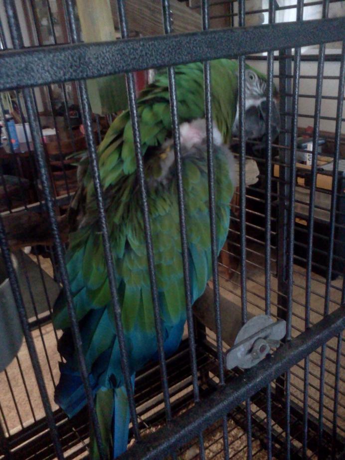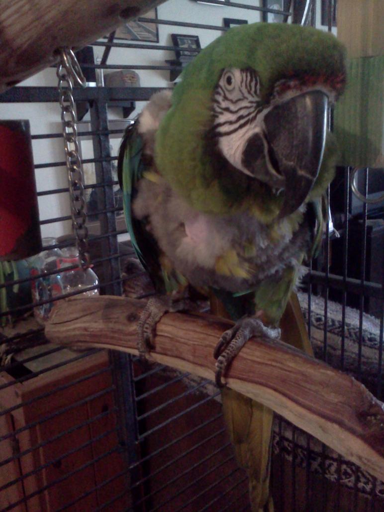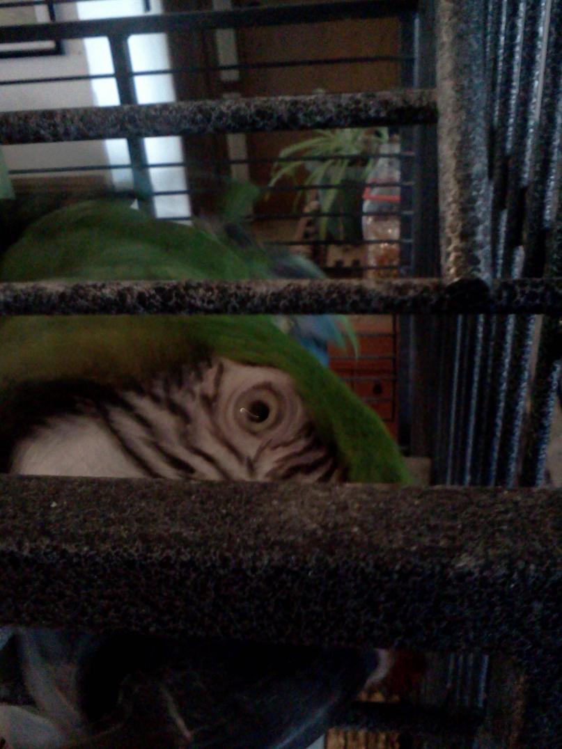 So as most of you know, Elliott has only been here for 2 weeks. He is such a great bird, and I want to pet him so badly. I am not complaining; I can feed him, clean his cage, and he will even take food from my hand. He never lunges at me and seems to trust that I would never ever hurt him. He tries all foods, so that is really great. But for now, no petting and he will not talk to me. He talks to my DH all the time. He is quite enamored with my husband. I believe I am jealous! I have to leave the room to hear his rather extensive vocabulary. I keep telling him how it's me who feeds, cleans, and buys toys and is sure that he is out as much as possible of his cage, take him to the vet, reads all the books, and even joins forums to be sure I am on the right path for him. He just stares at me. I may never get to pet him and I am fully aware of it, but he is so beautiful and I can just imagine how soft he would be. I may have to wait a verrrry long time but it is so hard.... He is adjusting though quite well, no feather picking or stress bars on new feathers, he doesn't squawk abnormally or make any screams of distress, so really I should have said nothing, but I know that everyone here understands the impatience at times and the irony of having a parrot you can't touch. He will reach to eat my toes while hanging off his cage....I suppose that is some sort of progress--LOL Well, I better get to reading really quick all the stuff I've missed since last time I was on. We are having severe storms coming in and I do need to make sure I'm ready with all my storm precautions. Elliott will really not like me if he is scooped up to the storm shelter really fast, we haven't had a chance to practice like I do with Roger.