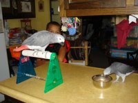 I haven't posted much but I do read alot of the threads on this forum. So here goes another post...I have a CAG that will be 2 june 23rd and a TAG that will be 3 august 1st. I have never done "formal" training with them and want to know is it too late to start? Also if its not what would be the best way to begin and what would be a good thing to start with? Emma, my TAG is a girl(she was sexed) she is a hurricane katrina survivor- which I believe is why she is a little skittish,timid and jumpy she was born down there and a breeder from up here rescued her and then hand fed her till she was weaned...I'm not sure how old she was when the breeder rescued her.I got her at 18 months of age from a private person who just couldn't give her the proper attention...she took to me quite well...she just has her moods but I've really gotten to know her body language and when she wants to be played with and when she dosen't. My CAG on the other hand is abig play baby I've never seen a grey so acrobatic and wild when playing...needless to say we've had a couple broken blood feathers...Monty is a jabberbox and learns something new to say everyday. He likes to be where everybody else is in the family even though he won't let anyone except me come near him and I can do practically anything with him. He is always trying to get by Emma but she dosen't seem to want to be friends with him as much as he would like. Sometimes I think Monty is a little dog in the house rather than a bird(he even barks)previous owners had little yappy dogs. I've had Monty 7 months and the old owner is amazed at the attachment he has toward me almost instantly. So here is a little background on my babies.Oh one other thing has changed since I've gotten Monty-Emma has taken a step back from talking. I don't know if this is bad/good or just a personality thing...so do you think they could benefit from training and do you think with thier very different personalities I should have different approaches with training? I know this was a mouthful but I really value your opinions and felt in order to give me advice you should have a little idea about them. FYI Monty is not sexed just assumed to be male...not that it matters I just thought i'd mention it. so any advice/suggestions are greatly appreciated. THANKS SO MUCH!!!
