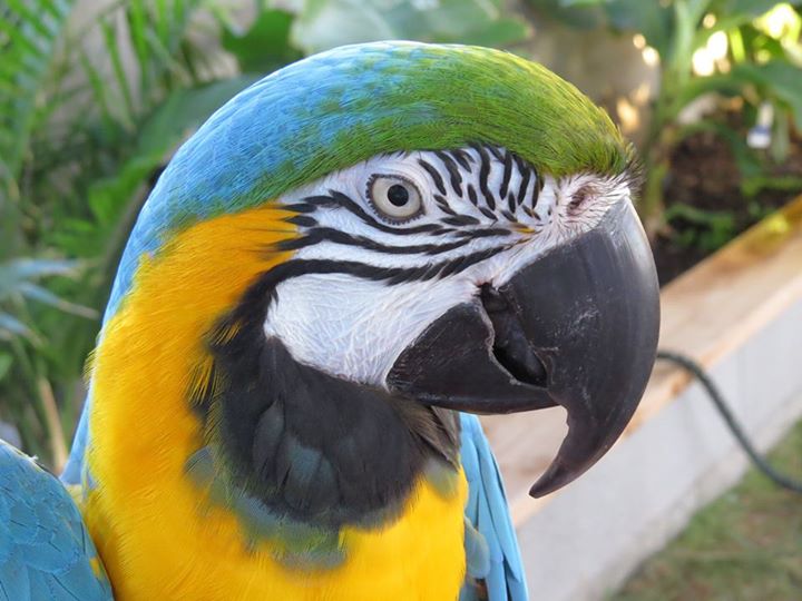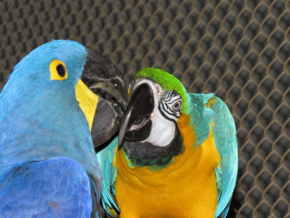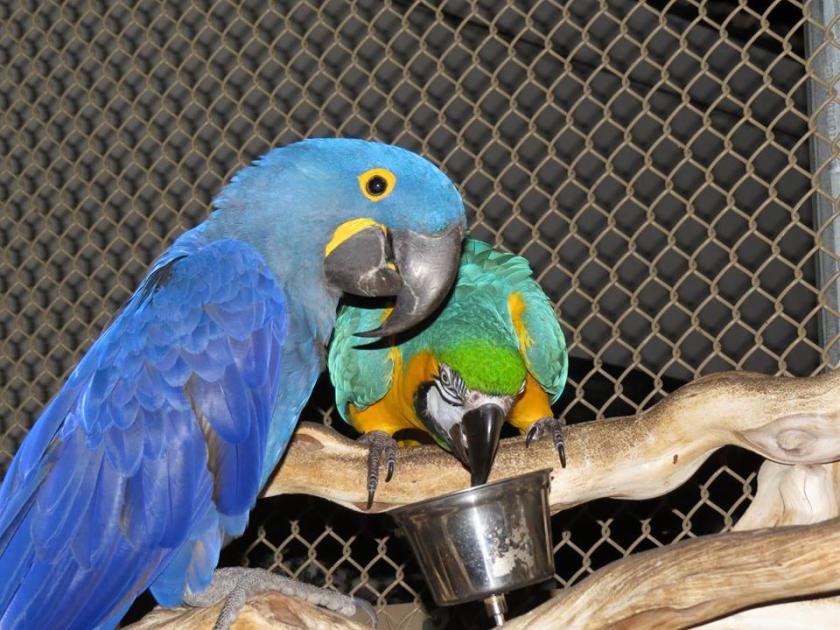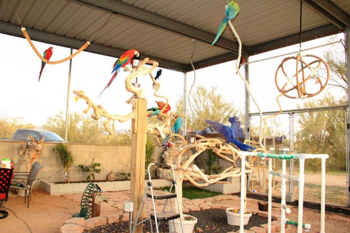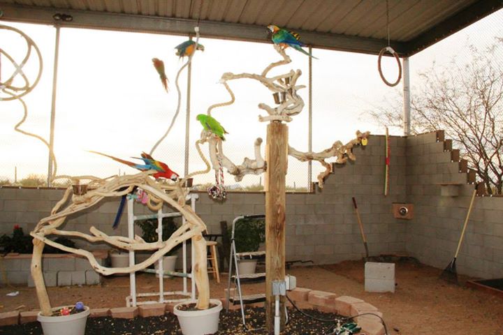 14. I got in touch with Regis's new mommy and she said it was fine to share pictures. She said she'd love for him to be a success story that inspires others. The other pictures of that horrid round cage were his old life. Now, here is his NEW life: Regis in the aviary Regis with his new big brother, Kaiser the Hyacinth - Kaiser has taken new birds under his wing when they have come into the family. The aviary (note the shower in the corner). I am sure Regis must think he's in heaven. Another view. Waterfall in this corner and look at all the play stands!!! Regis and Kaiser Seeing him happy and enjoying having a flock and freedom just chokes me up. But the tears are tears of joy. This is the kind of home we wish for every bird. -- Oh, and she thinks he may be a she because of behaviors ... DNA sexing testing is pending.