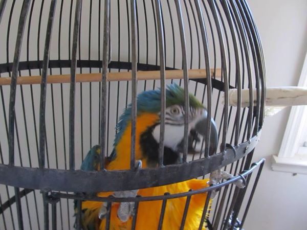 Regis the blue and gold macaw and Grover the Amazon were prisoners in tiny cages. As near as anyone can tell, they lived this way for at least 25 years, somewhere in Virginia. A kind veterinarian found out about their plight and immediately mobilized into action, trying to find fosters and hopefully permanent homes. I contacted her to let her know we could take them in even temporarily until a permanent home was found but she stated she wanted to find someone closer. She was also contacted by a woman from Arizona who had heard about the birds' plight and was willing to the take Regis. At first she was turned down due to the distance, but the vet stated she had this feeling, and after viewing the woman's Facebook page she found out they have a flock of well cared for and very spoiled macaws. It was apparent from her tons of pictures and videos that they literally live for these birds. She works from home and can spend lots of time with them. They have big cages but are out most of the day, and a huge planted aviary complete with an outdoor shower and waterfall to play in. But after just finishing the aviary, they were a bit short on cash to buy a last minute flight to pick up the bird. That's where we came in. The vet posted a request for frequent flyer miles. I let my husband, who travels for business, know and he agreed to donate the round trip flight. Meanwhile, a very lovely woman was fostering Regis and he began to bask in the new-found attention and actually being able to move around! Note how shredded his flights and tail are from beating against the bars in that tiny cage. On Sunday, his new mommy came and met him and Monday she flew back home with him to their beautiful paradise of a home with his new flock! We are very honored to have had even such a small part in this rescue. It's one of those perfect happy endings. Poor Regis has found a wonderful home with flight and flock and parronts that will love him. Grover is going to remain with the vet that rescued them. A win all the way around!