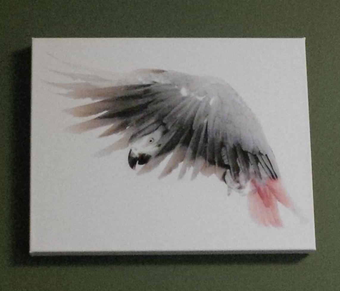 Sometimes the best suprises can come with tears... My husband took this picture a long time ago. It was just a chance shot, with an awfully cluttered background, but he saw the picture of Mar in flight and cropped it, masked out the background and it came out beautifully. He looks so much like an angel. I think the tranlucence is due to him being in front of a window and the light was shining through his feathers. Last night, he told me he *had* to go to Walmart. I waited in the car and he came out with this. Of course I cried. We are thinking about using this as a donor reward for donors who donate over a certain amount (of course we have to research shipping costs, etc.). I thought I'd share this picture here as I know many of you love flying pictures. If you want a digital copy, let me know.