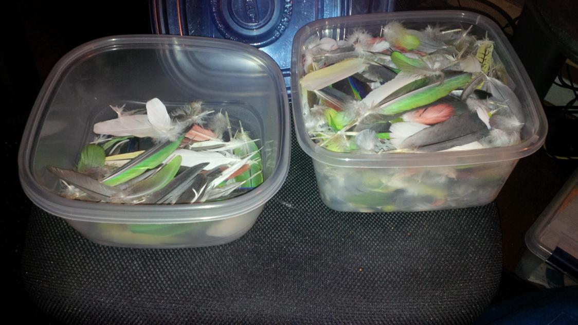 Marden's feathers Peck's feathers Everyone's feathers - the full container on the right is a 1-gallon bowl.
