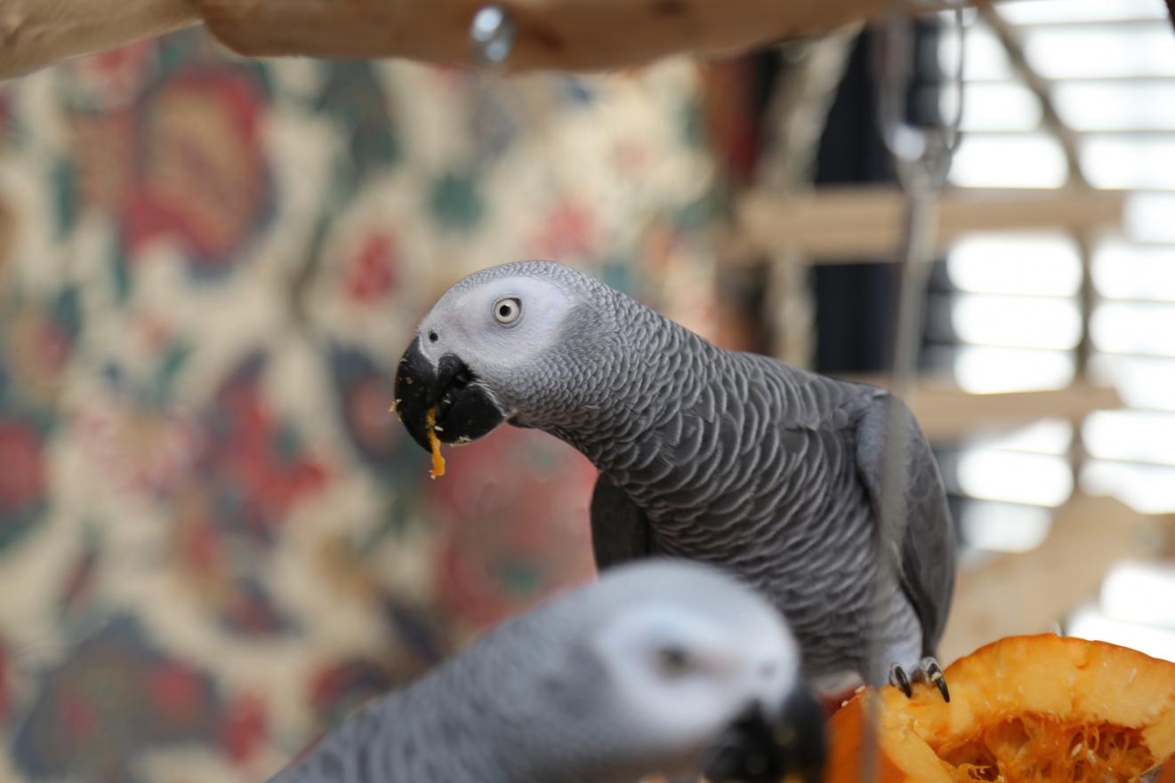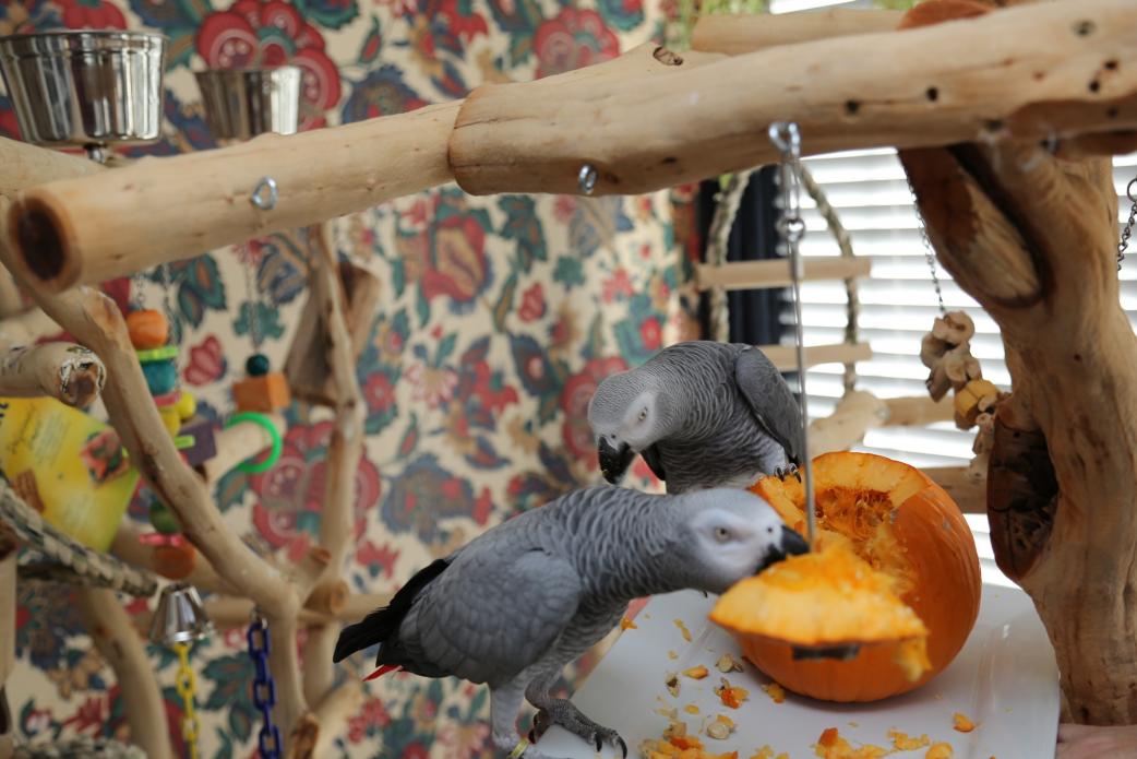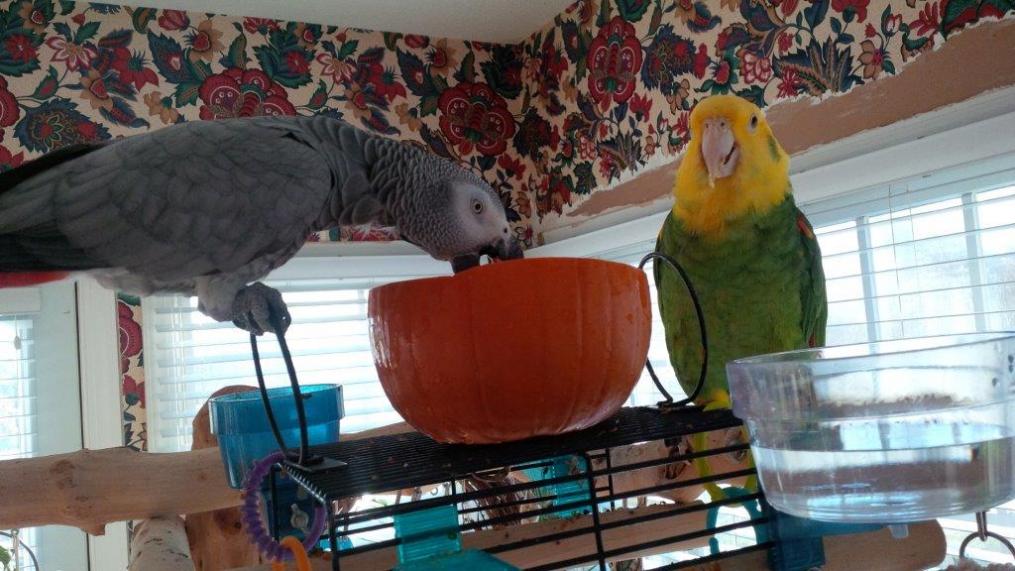 Happy Thanksgiving! Here's how our prep went: The feathered version - cut up pumpkins, place chunks with seeds intact in bowls. Add fresh chopped veggies, pomegranate, sprouts and nuts. Serve. The human version - drive to Waffle House, order, eat. I suspect there will be wine (or hard root beer) in this plan somewhere, later, once the mess has been cleaned up.