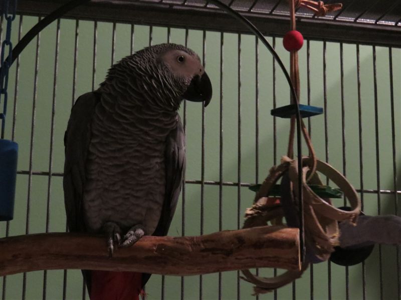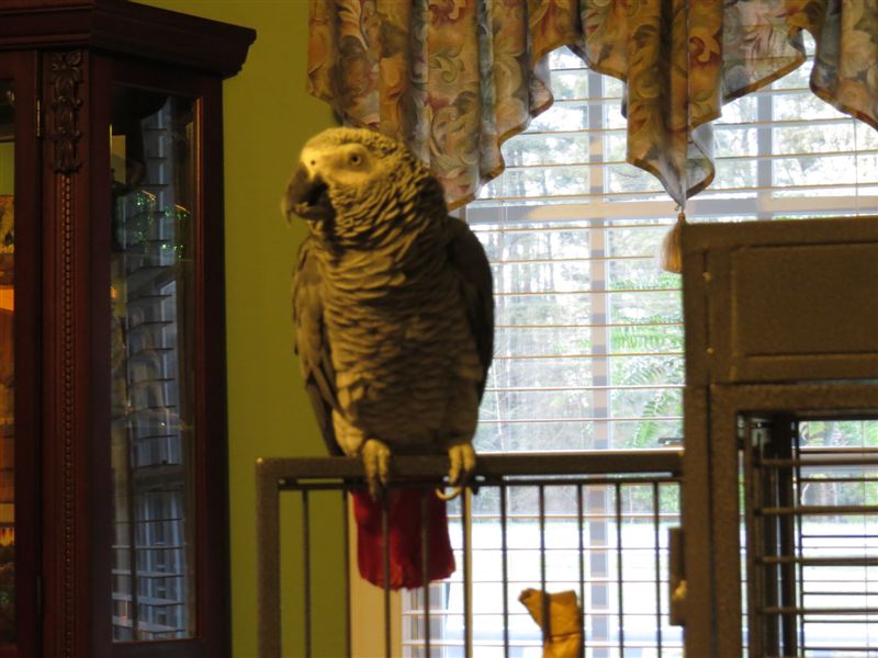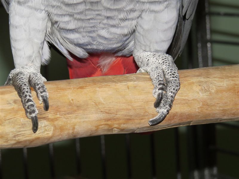 You can see his left foot is the affected one. The long toe was curled almost all the way around. The big joint where the toe connects to the foot is huge compared to the other foot. The foot seems weaker and the toe appears to have atrophied. Tonight I had him chasing my fingers all over the cage. He acts like he *really* wants to bite me and will make a bee-line for my fingers if they are even near where he thinks he can reach them. So I had him climbing and hanging from the top of the cage, and going from perch to perch chasing them. Hopefully by using it he can build some strength. It does not seem to be causing him pain, as perches on it just fine. But he could just be a tough guy, too. I spoke to his previous human, and she said she wished she'd have known he would tolerate the vet so well as she would have taken him years ago. She said when she took him as a young bird, he got completely freaked out and was shaking all over by the time they got him home. I know this was right after they got him, so maybe he was not long out of the jungle and completely scared by being thrust into our human "civilization"? I am just glad I know he does well at the vet, and he will get regular vet care now. I really love this little guy.