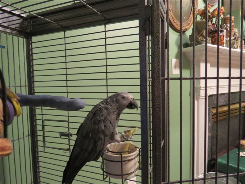 Wow. Just.... wow. These birds are SO smart. So today, I was working with Peck, standing close to the cage so he gets used to me. I changed his water, cleaned the papers, and then, since he was good, I offered him a few pine nuts. He ate them, but after each one, he would lift a foot as if he were trying to hold something up to his beak and make what I can only describe as an eating motion. Dense human that I am, it took me a few pine nuts to realize - he ate the pine nuts, but he wanted AN ALMOND. I asked "Do you want an almond?" and he bobbed his head. He's now happily munching on an almond in the shell. I am sure he is thinking that it took me long enough to catch on. He got down off the cage and wandered over to the fireplace, which has a marble hearth. I think the reflection amused him. Then he began to look at his distorted reflection in the galvanized "ash bucket" (for looks, it is not a real fireplace) that is sitting next to it. He examined it carefully for a few minutes then walked back and climbed back up on his cage. I will be glad when we can introduce him to Megan, because I think she will help him realize he is a bird. It hurts me to see him climb and walk everywhere.