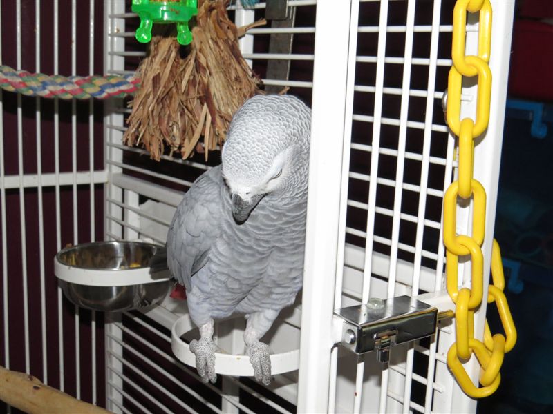 He does do the beak grind. He was sitting very contented on his swing a few minute ago, grinding away, eyes half closed, looking very relaxed. It made me very happy. He is going to the vet Tuesday at 1:45pm to see the same vet that has been doing a WONDERFUL job of reshaping Noah's beak. I hope she can help him. His toenails are also extremely overgrown and when I made the appointment I made sure they understood that the nails and beak needed a vet. Not that I don't trust the techs, but these are in pretty bad shape and I want her to take care of him because I know she knows what she is doing. I got the rope net from Craigslist, VERY cheap, from a gentleman who had to re-home his cockatoo because his wife became deathly allergic. He said he got it from Windy City Parrot. I steamed it twice before bringing it in the house. Here is the link where he said he bought the net: http://www.windycityparrot.com/Parrot-Climbing-Net--Large-Short_p_2476.html#.Uw8vx84dhS0 $140 is not a bad price. I lusted after one at the store where we got the Greybies and it was not quite as big and she had $190 on it. Finding this one on CL was just sheer luck. The ceiling protectors are just pieces of plexiglas, with a hole drilled in the center and a washer to hold them against the ceiling. Hubby says they are the right size, I say they are too small. We will see when someone puts a hole in the ceiling. I got the idea from the Macaw room at Project Perry. Matt used these as he did have birds 'remodeling' the ceiling there. The flourescent mop thingy is a ring, with strips of fleece tied around it. I bought the ring at the pet store (it's a solid stainless steel ring) and tied the fleece around it myself. I cut them in strips about an inch or so wide and tied them onto the ring with help from my niece. It is one of the things we are planning on making and selling as part of our plan to support our rescue. It was really simple, but time-consuming. It's such a no-brainer that you can do it while watching TV, though, so you really don't notice the time spent. Your caique sounds adorable. They are such fun little birds! My husband wanted one but knew he did not have the time to put in that they require, and at the time I was still in nursing school and had my hands full doing that, taking care of his mother and raising the two Greybies. We just did not think we could handle one. Then a few months later, he brings home Alex, the sun conure. >.< He was a handful at first - VERY bitey, but is now my sweetest baby.