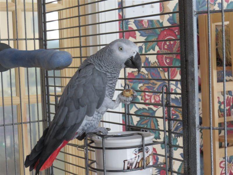 Nothing exciting to report today. He strikes at my hand through the bars, but I think it is a cage-defensive thing. Taking food from my hand he is gentle and relaxed. He came out of the cage several times. Instead of the playroom, I had work to do in the kitchen, so he stayed there with me. He is just dying to bite the dogs. I think they sense that. They are giving wide berth. He goes to the floor of his cage and does the "come here" whistle. Good thing they are used to Megan doing that and do not fall for it! He didn't give me any big photo ops today either. Tomorrow is another day!