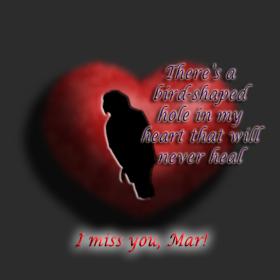 I have a page on Marden on our website. http://www.avianrefuge.org/mar.html It is not finished. I write a little, cry a lot, so writing it has been agonizing and very slow. Today Peck was very gently nibbling pine nuts out of my fingers and I had a complete meltdown. He sat calmly and gave me that look, and waiting for me to regain composure and begin feeding him again. I keep hoping each day will be the day I go all day without breaking down, but so far, that's not happening. Time heals all wounds, they say.