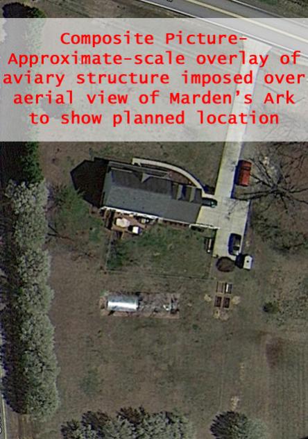 For Release 1200 February 04, 2015 Marden’s Ark Announces Donation of Aviary from Project Perry Aviary to be dismantled and moved from VA to NC. Youngsville, NC— February 04, 2015 — Today, Marden’s Ark is excited to announce that Project Perry is donating one of their aviaries to Marden’s Ark following their plans to upgrade the existing aviary to a newer, larger aviary at their Louisa, VA sanctuary. “We are just so thankful for this amazing gift,” said Dee Hicks, President of Marden’s Ark. “This is really giving a jump start to our plans here. Matt, at Project Perry, has been a great inspiration and has given us invaluable advice that has guided us in starting Marden’s Ark. We wouldn’t be here today if it weren’t for Matt and Kirah. We are just overwhelmed by this donation.” Project Perry is a well-established sanctuary for parrots in central Virginia. They recently began a fund-raiser to upgrade their existing small bird aviary. The new aviary at Project Perry will be much larger and better able to accommodate their growing population. The existing small bird aviary is an 8 year old structure that is being replaced and will be dismantled at Project Perry on February 16 and 17, then transported to Youngsville NC where preparations will be made to erect the structure at Marden’s Ark. This will be the first year-round outdoor structure for housing birds at Marden’s Ark. Their current population of 56 birds is currently being housed in typical cages in indoor living areas. (Photo Courtesy of Project Perry - http://http://www.projectperry.com/'>http://http://www.projectperry.com/) This is a shot of the aviary as it now stands on location at Project Perry. This was the original structure that started it all for Matt and his wonderful sanctuary. Through his generosity, it will live on at Marden's Ark, providing a safe place to land - hopefully for many years to come. (Photo Courtesy of Project Perry - http://http://www.projectperry.com/) This is a view of the inside of the aviary as it now stands on location at Project Perry. This is a photo-edited composite showing the planned location where the structure will hopefully be erected at Marden's Ark. (Pending "Call Before You Dig" Survey, etc.)