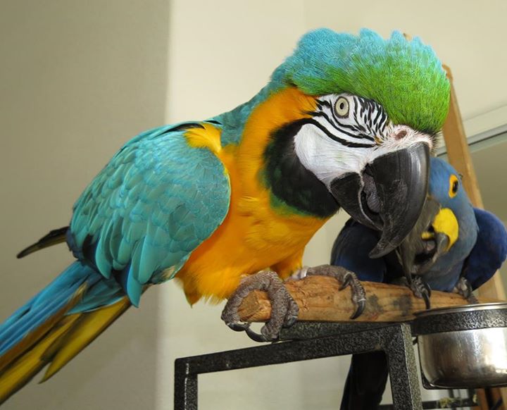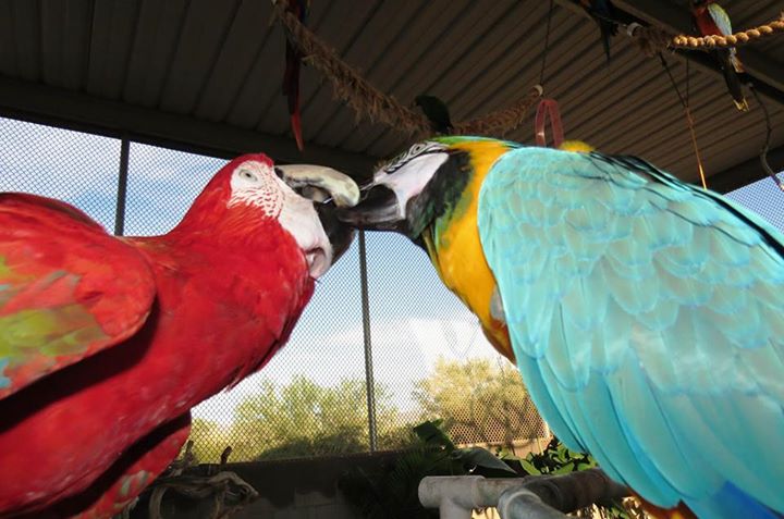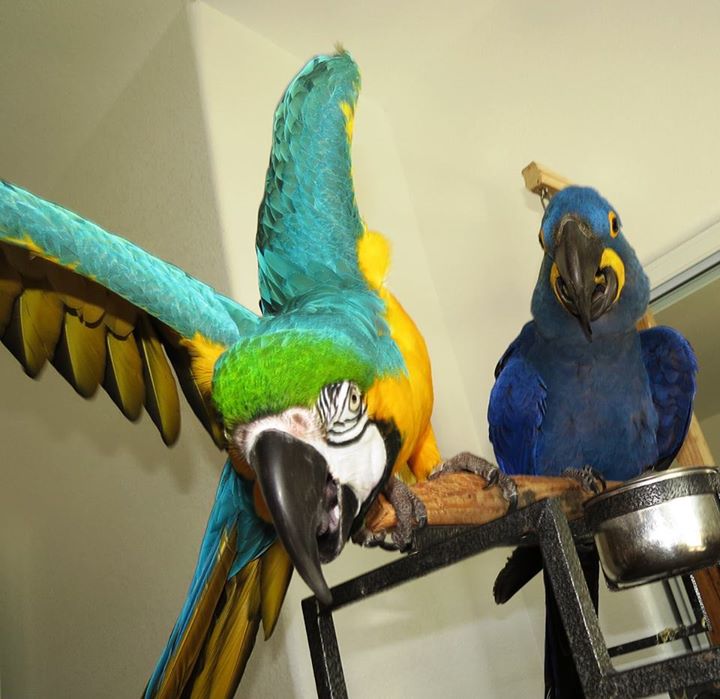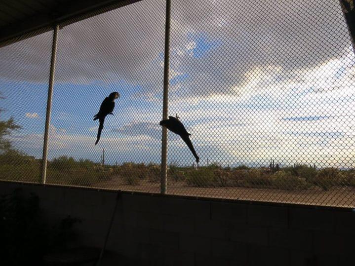 Lots of space for flying or just hanging out watching the sunset. Meet and greet with another flock member. These last three were taken of Regis when he was showing off his new-found macaw attitude. Look! I'm BIG! And SCARY! Nice to see he knows how to act like a macaw. His mommy was very happy about this. So the DNA sexing came back and he is a HE - all boy. He's blossoming under her wonderful care. He's actually preening Kaiser already which is unusual for birds who just met, and even more so for one who has been isolated for so many years. He also has begun asserting himself and acting like a macaw! Every picture she posts gives me a feeling like I have never known. It just makes me so happy to see this bird who had an absolutely miserable existence for 25 years come into such a perfect home.