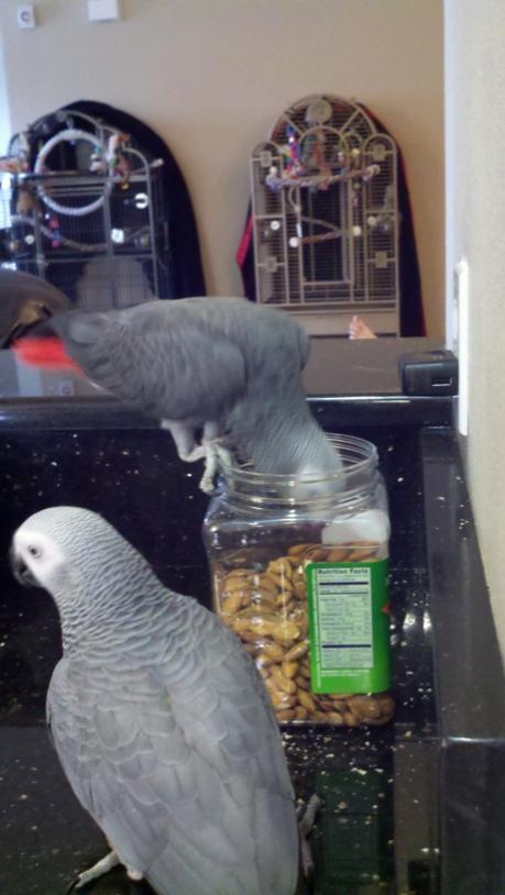 Well, it's time for me to join. I feel like such a dummy these days, and I swear, just when I think I understand my birds they kick me in the rear I'm hoping this story has a happy ending for good, but just in case, I'm logging my entry to the club Gryph just turned 3 and boy does he have a wild streak. I've never had a bird that was a biter! At first he would nip when he was angry and then occasionally he would bite if he didn't want to do something, like step up. Then, about six months ago it was like all hell broke loose! I thought it was hormones or the terrible twos stage or something crazy!!! Any time I tried to get him to step up he'd lunge at me. I attributed this to the fact that I am short and all of his perches are tall, so I'd get a step ladder. At first, this worked, but then as time went on he started biting even when I was taller than him. If he didn't want to do something he wouldn't just give a warning nip, he'd bite the crap out of me. Then it morphed into suckering me for a kiss and trying his best to pierce my lower lip (which was successful, coulda hung a stud in it.) Finally, it transitioned into randomly biting my face with no warning, and when he finally landed a piercing bite a mere 2mm from my eye, I was fed up. I had scabs and scars all over my hands and face! EEEK! I tried everything to get him to stop, but in the end I was just so tired and scared of being bit or losing an eye that I didn't even want to interact with him. I started to think the best option might be finding him another home. But I told my husband...I've got to be doing something wrong, he wasn't always like this! And who wants a face-biting bird anyway? And even though his aggression was every day, there were still good points to our relationship - he only wanted to be with me and he got jealous if I paid any attention to his sister. He also never bit my husband or anyone else, only me. During feeding times, he always wanted to share my food and would in fact bring me food to eat. I seriously felt like a battered bird-wife! After a lot of reflection, I decided there were a few big problems. First and foremost, my approach to the whole situation had degenerated into yelling at him, leaving him caged and trying to dominate him, all of which were only making his aggression worse. Secondly, I decided he probably had some insecurity about his place in the flock because everyone had strong happy bonds except him, so he was always being excluded due to his aggression. Lastly, I decided that it was my fault he had learned these behaviors, so it was my job to help him unlearn them. While I never praised him for biting me, I realized I had inadvertently reinforced his biting by giving him no other kinds of interaction. My husband pointed out that while I wasn't a "bad person" or "abusive" in the ways we traditionally think about those things, it had become very apparent that if I was aggressive toward Gryph (by yelling or towering over him or demanding him to step up), he was aggressive right back, and now he was just aggressive all the time because that's what he'd come to expect from me. I decided I had to remove all forms of aggression from our interactions, even if that meant we didn't interact at all sometimes. The first thing I did was start using Sally Blanchard's principles of "Nurturing guidance" through regular step-ups and step downs, and after about 3 weeks of practice, we were starting to have entire "good days" where I didn't get bit. Every morning and evening we would do a quick step up session, and then again any time he displayed aggression. Sally's idea here is that by enforcing the step ups, you are enforcing your role as the dominant part of the relationship in a positive way, and over time the bird learns to trust your leadership. The second thing I did was immediately cease yelling or showing any kind of dominating behavior. If Gryph lunged at me, I would quietly chide him in the same tone I would use as if I was just talking to him, with no anger or frustration, and then walk away. If he bit, I did the same thing. Sometimes I'd come back five minutes later and he'd still be mad, so I'd walk away again without interacting with him. When he was being good though, I got super animated. I'd praise him with huge, over-pronounced sounds and lots of kisses, whistles and noise. I'd play catch with him - his favorite game - and tease him and give him toys so that he was the center of attention. I'd also praise him for the smallest things. If he was running around on the couch, I'd normally just ignore him...now I started telling him how awesome he was. It was really starting to have a good effect! There was still one little problem though. He still got aggressive when he was on a perch higher than me. I would talk to him gently and eventually he'd step up, although sometimes it was not without a few lunges. Then one day he didn't want to come down because he knew I was going out and that meant he was going in his home. We had been doing so good that day, but every time I tried to get him to step up he lunged to bite. Finally, after 15 minutes of frustration and trying to get him to step up, I'd had enough. I looked up at him and in a calm but resigned tone, said, "Come on, buddy. Do you want an almond? Just step-up-" I had just gotten the word "almond" out when he raised his foot and leaned forward to step up! No biting, no aggression, just pure willingness to do what I said! OH JOY!! Another two days went by and each time I tried to get him to step up off his high perch and he lunged, I'd offer an almond. I didn't hold it up to him - I'd ask him if he wanted to go get an almond, and then when he stepped up I'd take him over to the jar and let him pick out his own. He even started to give me a kiss after he got his almond. EVERY time it worked, and pretty soon he was lifting his foot without being offered a reward at all. It has been three weeks now and in that time he has not bitten me on