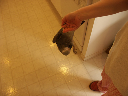 Awww, your grey sounds like a sweetheart Athena is a bit of a t-rex at eating time. There is definitely no cuddling till AFTER the little beast is fed Usually I get her up about an hour before I go to work. I spend a few minutes preening her face while she's on her cage perch and this seems to help her wake up. Then I go to the kitchen and start making her breakfast - usually a mix of warm pellets, baby food or oatmeal. She'll hear the microwave or the pantry door and come to investigate. While she's eating I change her cage paper, wipe down the cage and refill her water and seed dishes. Then we "snuggle" for the remaining few minutes, which can be anything from her snuggling up to my head while I'm on the couch or her just preening herself on my shoulder. Then it's back to the cage and I'm off to work. When I get home I let her out of the cage and make her dinner, which is a mix of fresh veggies and fruits and whatever I'm having for dinner. After that she usually plays with her toys for an hour or so, then we spend the next few hours watching tv with Daddy (she sits on my shoulder and receives lots of head scratches). Of course, that all changes as sometimes we work out, clean house or do other things. Most of the time in the evenings she doesn't really care where we are or what we're doing, as long as she can be included As for training, I try to incorporate that as a regular part of our interactions. At this point she is so young (a year) that most of what I'm training her IS stuff that we'll want to use all the time. Things like flying to me when I call her, staying put, eating certain foods, stepping up, not biting, and potty training are all things that we reinforce the entire time we're with her. These may not be natural to her wild brain, but they are the basic building blocks of our relationship, so I try to be as patient as possible to reinforce these things all the time. I'm not terribly interested in teaching her to do "tricks" at this stage of the game (although she's learned a few on her own) but I do talk to her often. It's having a really positive effect as over the last 2 months her vocabulary has gone through the roof! Anyhow, good luck teaching your grey and keep us updated on her progress!<br><br>Post edited by: zandische, at: 2008/03/17 23:06 -