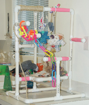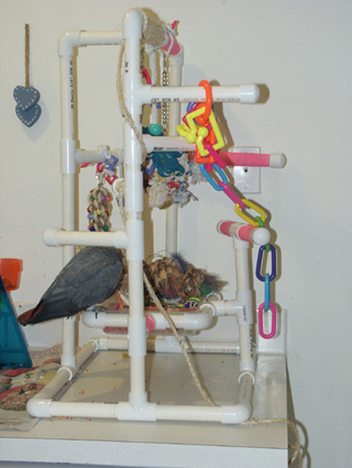 Ok, I'm showing off a bit here but I can't help it! I'm so happy that this gym turned out the way it did. And I'm even happier that Athena LIKED it so quickly! This gym is made from 3/4" pvc and is 16" w x 20" d x 29" high. (If I had more space I think I would've made it about 5-10" wider) About 6" off the ground is a center foraging basket that holds a removable tupperware box. You can't see it in these pictures because it's not quite complete yet, but I've wrapped all the perches in vet wrap and I'm working on 1/4" sisal up all the vertical poles to make it easier for her to climb to the upper levels. If you guys are interested, I'll scan my plans and measurements for you. As you can see, it didn't take her long (a day!) to figure out that this was a fun spot to hang out! <br><br>Post edited by: zandische, at: 2008/05/06 06:50