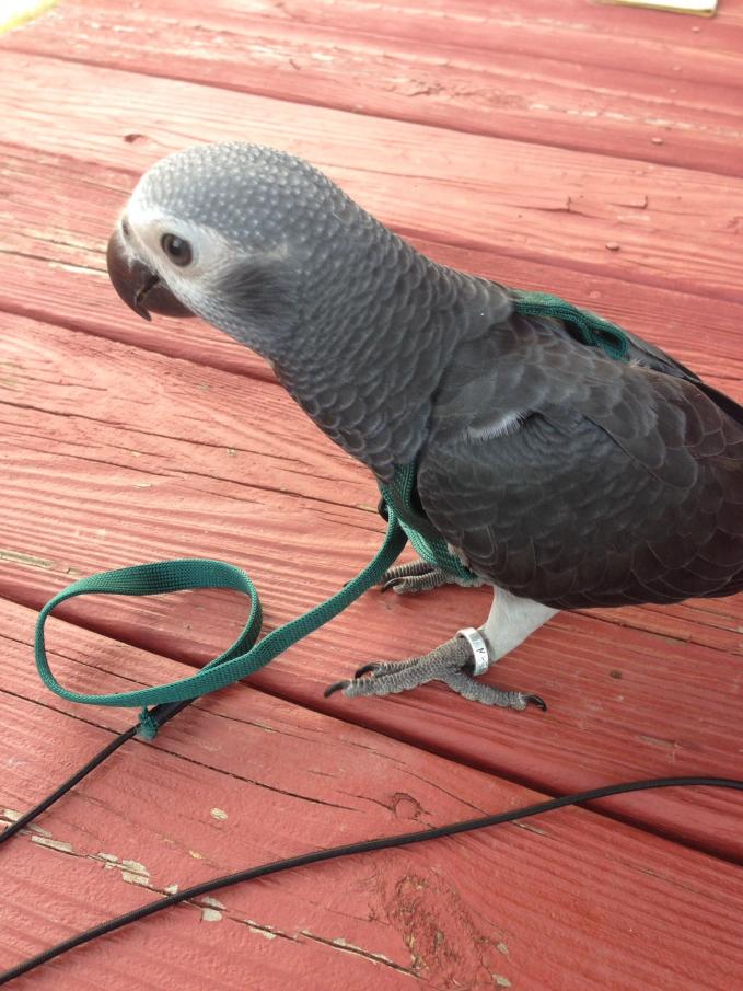 20. After introducing the harness to Gabby a few times during the last couple weeks, I decided today would be the day. I'd practiced placing it over her head a few times with no trouble but the one time I placed it on her, a week ago, she accidentally got her leg inside and lost her balance. That was a "no go". She was not happy. Anyways, today we tried again with no accidents. She was a little uneasy because it felt strange and given the chance, she would chew on it. It was messing with her feathers (and you know how girls are with their hair.). I kept her entertained walking around the yard. I could tell she was loving it even if she was a little nervous. She stayed on my shoulder a bit cause she feels secure there. She'd come down onto my arm some and would hide her head in the crease of my arm. Before long she'd be peeking out and then came onto my hand and just took it all in. We stayed out for about 15 minutes and I could tell she was wanting it off because she kept chewing on it. I don't think I had it quite tight enough around the middle. Once inside I took it off and she was very calm about me removing it. Didn't even try to bite as she did the first time. I consider that a successful first venture and hopefully we'll try again in a couple of days and she'll eventually look forward to it (fingers crossed). We are also working on acclimating her to the shower. I'm turning it on and letting her watch me put my hand in the water while I tell her how much fun it is. Three or four times she has ventured off my shoulder on to my forearm to check it out. She's a curious one! I'm hoping to take it slow and eventually she'll warm up to it. So that's our big day! We both have made great strides in trusting each other and it's great. Now if I could get her to quit pooping on me. Geesh!!! Any suggestions? PS. I stupidly forgot to bring my camera out, so no pictures. Next time I'll remember. She looks quite special in her dark green harness even if it does mess up her feathers.