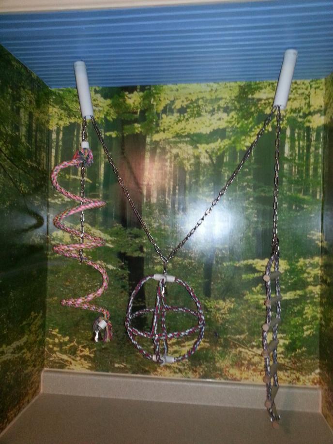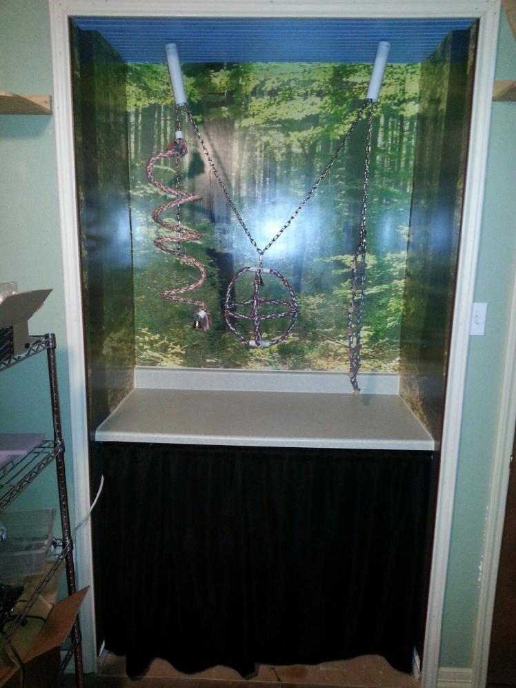 We are less than a week away from getting our Timneh baby and can hardly wait. I had an area that used to be a closet in the main room where her cage will be so I wanted to do something functional for her. This is what I came up with. I have some storage under the black curtains and the beige surface is laminated rolled edge counter from lowes. I got a damaged one for $25 We found a cool wall mural on amazon that is applied like wall paper. I clear coated it will acrylic coating so we can wipe it down easily. I used stainless steel chain and put 1 1/2" PVC pipe on the top to keep her from climbing all the way to the top. I wanted to be able to add and take out toys easily. It makes me want to climb on and play on it already but I wanted to get some opinions on what you all think.