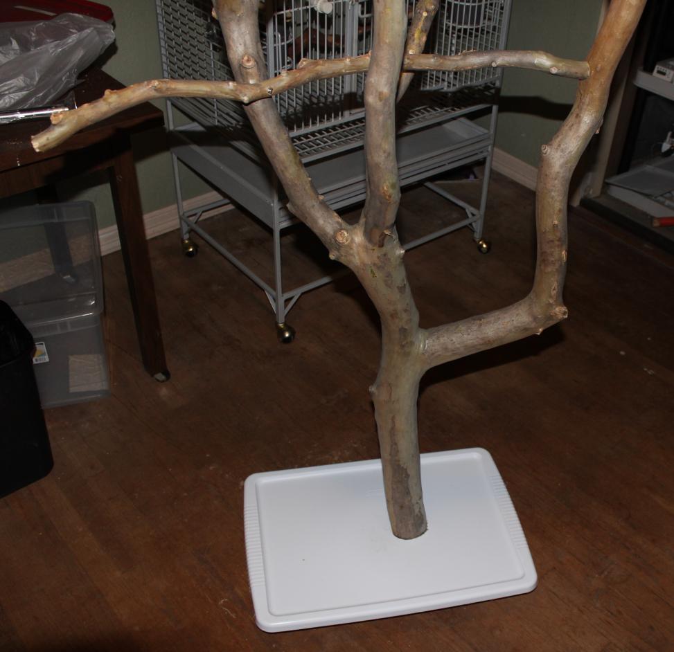 I built a playstand yesterday. Let me know what you all think about this. I have it mounted to a 3/4 peice of plywood with a large lag screw coming up through the middle of the trunk and another screw to keep it from spinning. The stand is right around 5 feet tall give or take a few inches. I took quite a bit of time to get it balanced just right so the tree would stand by itself without the bottom. Makes it really stable. There are 4 locking casters on the bottom so it rolls really easily and the white plastic bottom cover is a sterilite lid from a large tote. The wood is Crepe Myrtle. I saw that it was on the safe wood list so I downsized one of our trees to make this stand . I plan to hang some small toys from this in the next few days. Any suggestions on perch placement, etc are welcome. We will have our Timneh African Grey within a month so this is for her. Thanks!