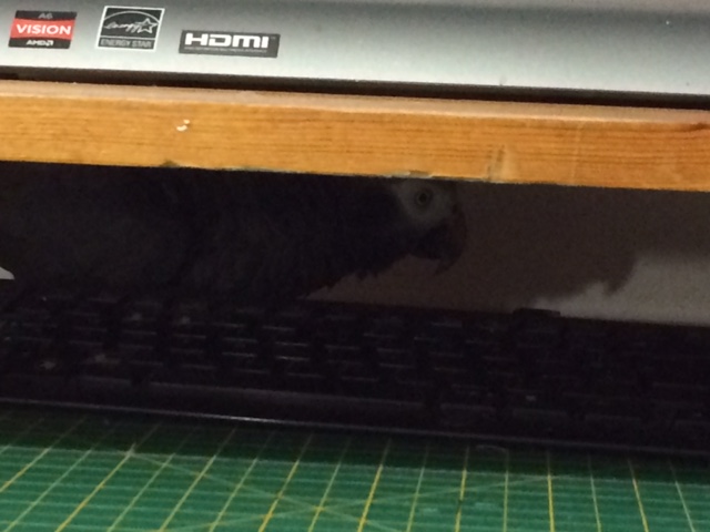 Echo only has a sleep cage, and is free in her bird room during the day (well, from 6 am to 9 pm LOL) I have a dog walker that comes Monday - Friday and the other morning, she texted me this pic of Echo ... stalking her! There was also a video of her running up and down the windowsill bobbing her head and hollering out HELLO HELLO HELLO! Gotta love those greys!