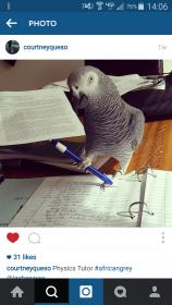 1. Hey all! Just found this forum and since I've had my African Grey Isaiah for about 6 or 7 years now I figure it's a good time to see how other grey's are and get some new training ideas etc. He's the coolest bird I've ever had and he LOVES mimicking every noise in our house...especially the fire alarm when he wants attention. that's him doing his physics homework. He's super chill, not really afraid of anything. I'll put a new toy in front of his cage to get him used to it and within the hour he's trying to get at it to destroy it! Anyway thanks for looking and I hope I learn a lot from everyone :cool PS: sorry the image is so big lol it's a screen shot from my girlfriend's IG. She loves playing with him although he likes to nip at her because she's kinda dramatic and loud when he does