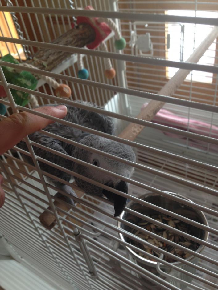 6. Hi, I have a parrot and he is 17 month old I dont know the gender and he is very cuddly, whenever I go near to him, he sticks his head out and whenever I want to carry him, he gives me his head to pet him, he still doesnt talk but he makes noises and the only thing he learned is his name moy moy and how to cough, when he was small i sat hours petting him. I hope ill get along. thank you (sorry about the grammer)