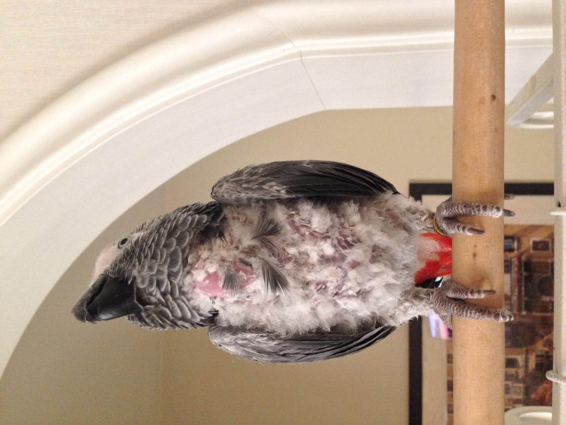 2. Hello, My parrot feathers started to fall down 7 months ago and last month i took him to the vet, he gave me a soother spray and injected him with something. Now his white feathers came back but why its not growing back to his original form. Thank you This is his current photo