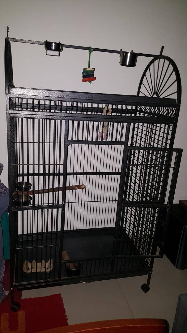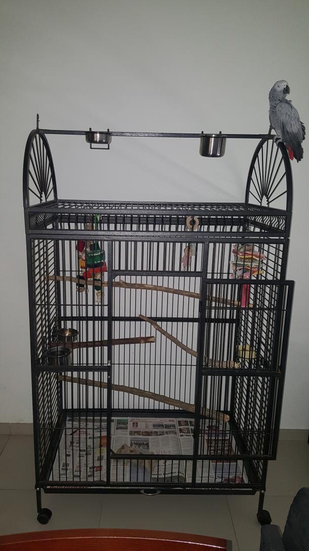 She is a bit scared of it not terrified i would say. While in her cage, she comes close to the new one but then we can hear her breath a bit heavily and she goes into her little hiding corner. I also did add a few of her toys from her old cage into the new one so she knows its a familiar place. I was even playing with the dishes and toys in the new cage so it would look like a fun place to be for her although i must admit i felt a bit silly playing with a cage in the middle of the night but i have learnt a grey can get you to do all sorts of things you don't want to do lol I really like the idea of joining them with a perch i think i will get home and do that today as well as put her favorite snacks in the new cage. We definitely don't have space for two cages in our tiny flat and this new one takes up a lot of space in our lounge it makes the room feel a lot smaller but im so happy to get nonsense in there as soon as i can. At this point its all about getting her use to the new home she wont be able to live in it just yet as i still need to give it a proper wipe down and also need to get longer perches to fit the new cage and also TOYS TOYS and more TOYS. You swear i was a lot more excited then nonsense is.