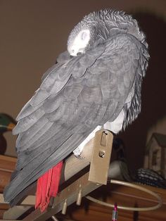 Thanks for all the ideas and suggestions. Still trying to source a few things. I can get the grate made up of S/S but its going to cost a lot more, so i'm going to save up for a bit and then get it done. Might be a stupid question but does the grate NEED to be painted if its S/S? The paint shops around here seem to be a bit clueless as to what "Bird Safe" paint means so i'm worried that one might say it is when it really isn't and then nonsense gets sick. I wanted to put the ladder up on top as well so will give that a shot and see how she likes it. @Greyness Nonsense like to shred EVERYTHING. You must see her attack her foraging toys i make up for her, gone in a few seconds. Newspapers, toilet roll holders, those cup holders from McDonalds, boxes she goes crazy for them all. I will try to get a video but she is very camera shy. @Timbersmom Nonsense is strange because she doesn't like being on the highest perch she likes the middle one the best. She likes being on the floor when she is in destruction mode and i have never seen her on the highest perch as yet but she is making use of all her toys so i'm happy about that. Have you guys seen how your greys sleep? I saw nonsense for the first time when she didn't want to get into her new cage and was perched on top of it. She turns her head around and places it on her back and pulls her wings closer to her face and then she falls asleep. Was quite fun seeing her do that. This is exactly how she sleeps: (This is a pic from the interwebs)