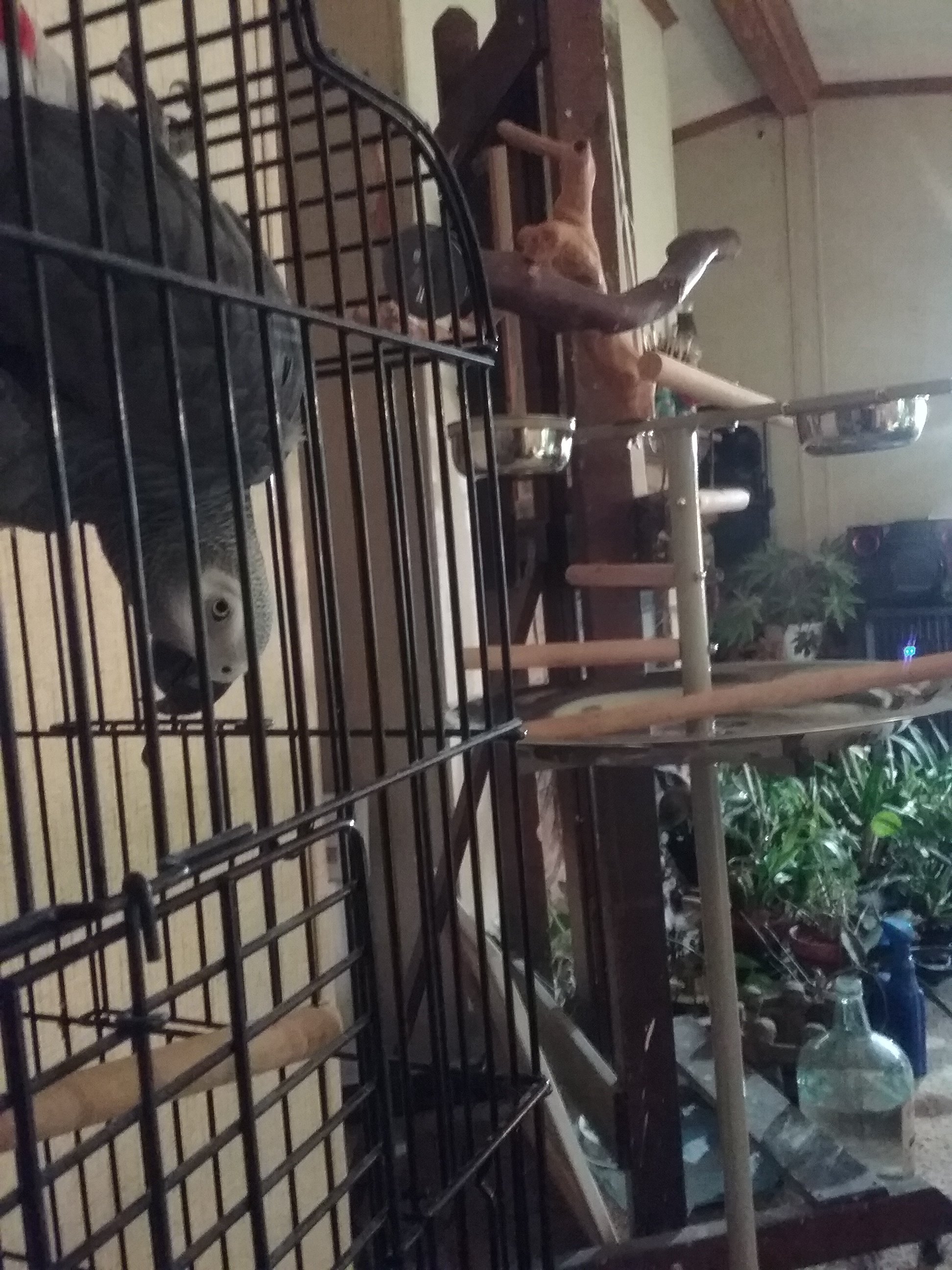 Thanks again for the welcome, everyone! Willy's doing really well, talking up a storm and seems overall relaxed and playful. Right now I've got him in my studio (attaching pics from his view- forgive the plant mess, I just moved everything back inside for the winter, and am placing everything painstakingly), as I'm generally in there working. He has a rolling play stand, and I'm setting up a flight cage in our living room for him, too, so he has a cage besides his studio bedroom cage, and can be more in on the action after he's settled a bit. He's going through his sounds to see what gets my attention when I'm not in the studio. I am ignoring anything I don't want repeated fifty times a day. 😊 We took a nap together yesterday during a nice autumn thunderstorm. (After I managed to get soaked wrangling the guineas and chickens back into their coops, lol.) Only issue I'm having so far is trying to get him to accept pelleted food and veggies. Always was a seed and fruit junkie, and that has not changed. I'd like to balance his diet, though. Any tips?