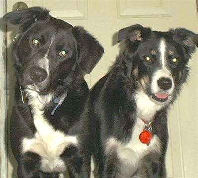 Here's our two dogs. They are both half Border Collie. Tucker is half Australian Shep (has the brown markings) and Elvis is half Black Lab smooth coat (tuxedo). We also have a cat (Peeve) and CAG, Mr Boo. We call this pic The Bookend Buddies