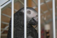 Hi! I have posted a few messages already, but today I am happy to say we actually brought home "my first grey", most likely to be named Jeffrey (will be DNA sexing though...)! Jeffrey was brought to our home because, when I initially wanted to begin keeping birds again, I went to a parrot-specific store nearby, and paid for a Senegal that was not yet weaned. While he was still being fed over the next month, I visited him every day, and meanwhile, I saw this Timneh Grey in a cage next to him that was always making noises but nobody ever really paid much attention to him. At the time, I thought he may have belonged to someone and was being boarded at the store, because he had no price on him. Anyway, after bringing my bird home, I stopped back in there to get some paperwork and saw him in another area with a price now. I asked about him, and was told he had been there for about a year, and was not sold as a baby because he had injured himself on a toy (a metal staple cut into his belly). It took a long time for the wound to heal, and they had had to put a collar on him, so for a long time he was off the market. At that point, he was pretty raggedy looking, missing a lot of primary feathers, and was not so friendly anymore. I felt bad for such an intelligent, sensitive bird like a grey to be alone in a little cage at a store, and started visiting with him out of curiosity, with no intention of buying another bird from a store. However, I couldn't seem to help going back, and eventually I thought, "if he's still there in a month I'll think about bringing him home". Well it didn't seem like aybody really had any interest in him. There were already 4-5 new Congo babies in the store, and nobody ever looked at him anymore. Of course, that was about 2 weeks ago and I finally couldn't stand it any longer. I brought him home tonight, and he ate some food and made some noise, and had some nice treats put in with his pellets. He has a humongous cage compared to his last one, bunches of toys, and will have lots of attention & love. He was much less shy coming to a new place than I expected, as he has been stuck on the front of the cage or near it, and already seems to enjoy the attention. I am so excited to have him here; did I mention that??? Julie