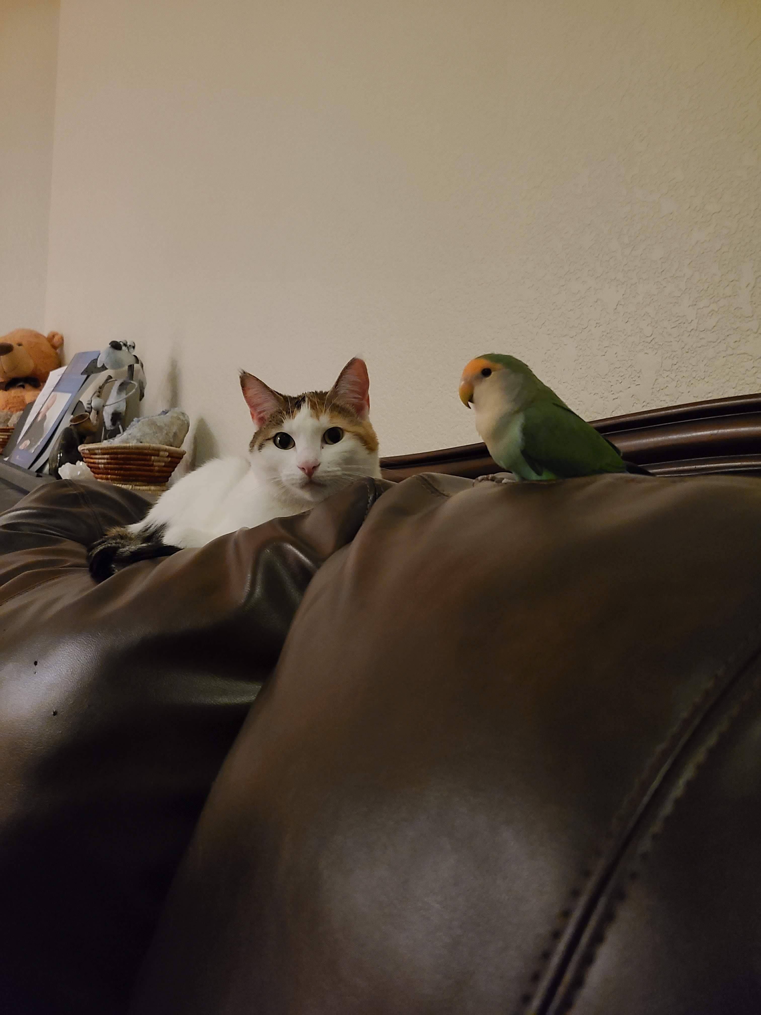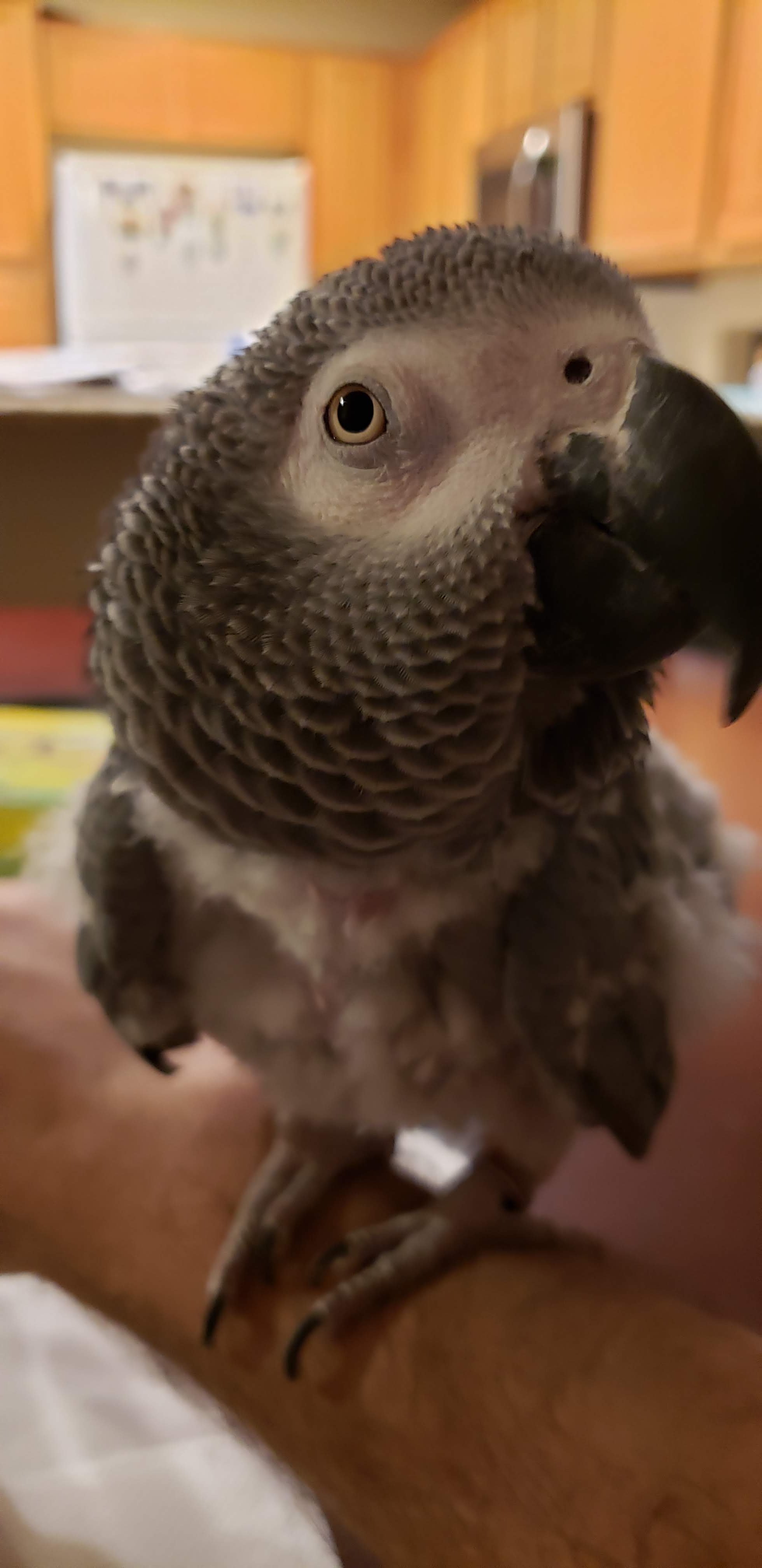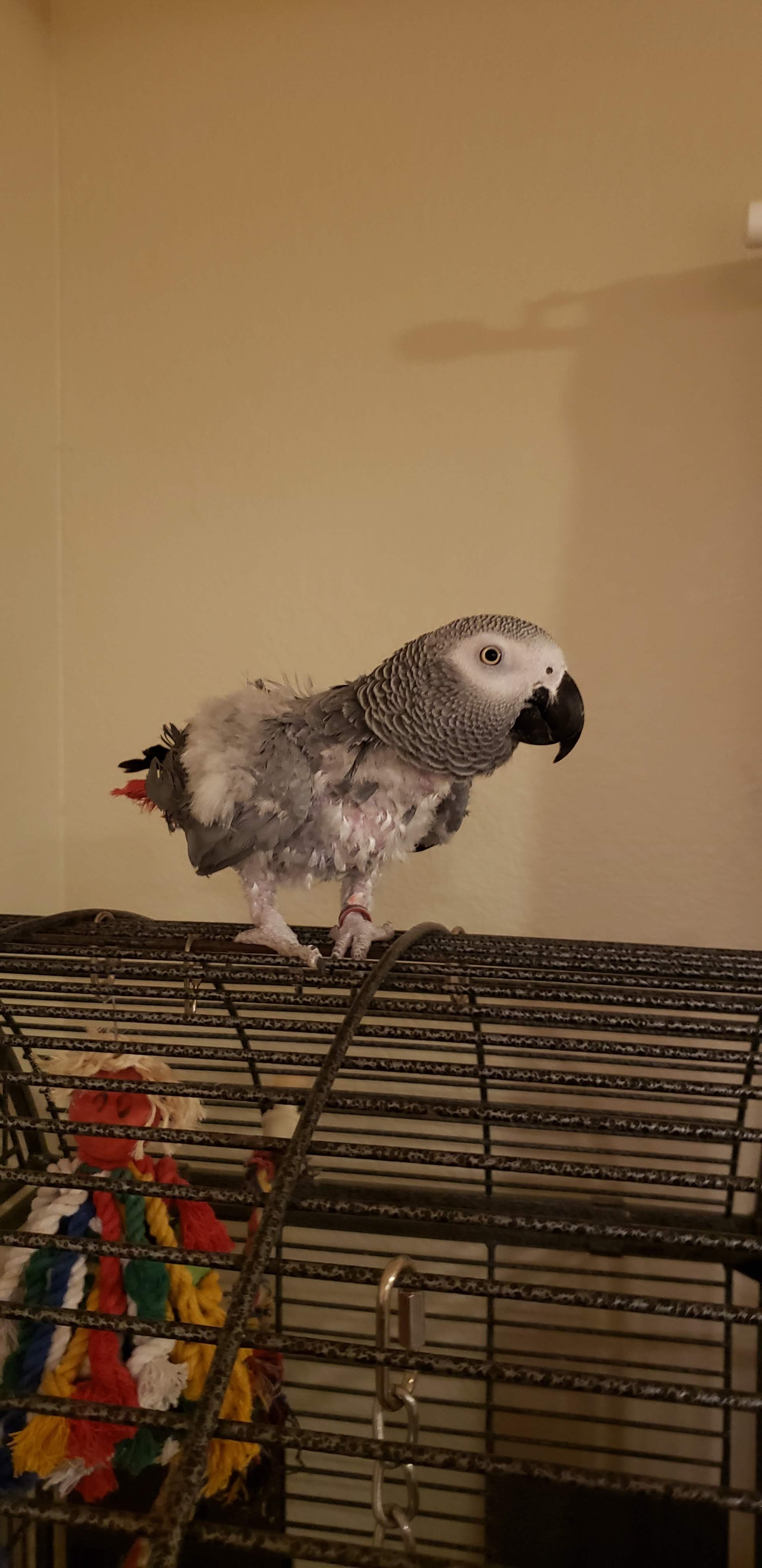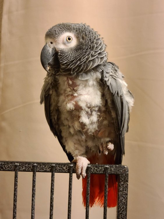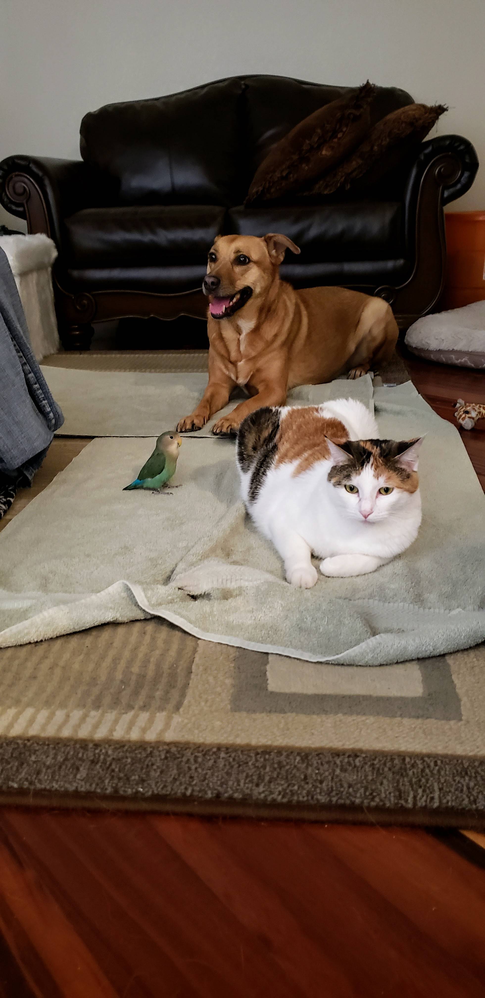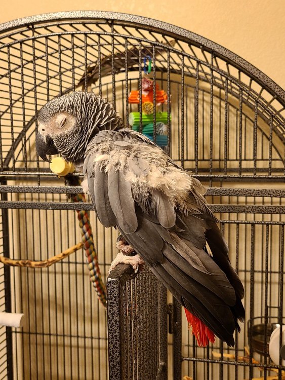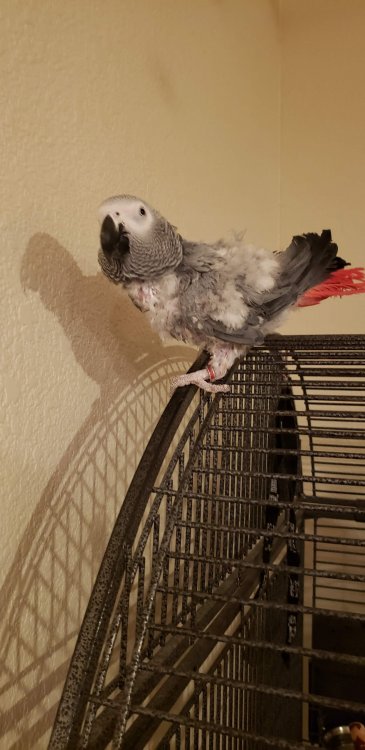 Hello Everyone! I'm so excited to be a part of this group! These forums were super helpful for when my husband and I were doing research before adopting our CAG, Rhubarb (Ruby for short). We knew we didn't want to get a baby African Grey and we wanted to rescue one because there are so many birds out there who need good homes! This will be a slightly long post as an introduction but I will include lots of pictures! Anyway, a little bit of background on us, we have a dog (Jelly, 8 years old), cat (Jams, 4 years old), and lovebird (Kiwi, 2 years old) who all get along very well! We had adopted Jelly first, from a shelter, when she was around 2 years old. She had been bounced from shelter to shelter and her previous owners would tie her up outside at night but allow her in the house during the day. We are pretty sure she was abused as she'll flinch when we're holding a broom or some other object and we have NEVER hit her. She also had a lot of separation anxiety and PTSD from thunderstorms as well. We have worked through those and is a very spoiled puppy now. We got Jams around the time when Jelly was starting to get sad and lonely being home alone when we were at work for long hours (weird schedule back then) and she took to nurturing Jams like her own baby! Jams was around 5 weeks old when we adopted her. She was born on the side of a church with a few other kittens and her mom didn't come back for days. We were thinking the momma cat had been killed. âšī¸ Jams and her brothers and sisters were promptly adopted out to different families. Since Jams was raised by Jelly, she acts more like a dog than a cat. She is of course very spoiled as well. We had gotten Kiwi after we had been watching my younger sisters budgies and Jams was very excited to have them around. She would sit by the cage and watch them all day! She was very sad when they had to go back home to my sister's house so after a few months we decided to get a lovie and they've been best buddies ever since! Not sure if Kiwi even thinks she's a bird because she scoots around the floor with Jelly and Jams (she is able to fly but prefers to walk, although we are recall training her which she is having fun with!). Here are some pictures of the three: Now let's get on to Ruby! Geoff and I had been looking around at rescue shelters to see if we would come across an African grey (or other bird) who would take to us and want to come home with us. But because of the pandemic, volunteering and helping out at shelters have been nonexistent (they wouldn't take in new volunteers). I just happened to be browsing Craigslist (because people list birds there all the time) and she was listed on Craigslist that same night I was browsing. The family said that they couldn't take care of her anymore and needed to be taken in by some other family. We went to go meet her (to make sure she would actually like us) and fell in love! The current owner told us her background: - She is currently 19 years old. The first 15 years of her life she spent with an older gentleman (we are thinking British from her accent) and she was raised very well there (based on how she interacts with us and her training). The older gentleman suddenly passed away (we are thinking he was involved in an accident after he had left the house because she has separation anxiety whenever my husband leaves the house, working on that). - So then she was picked up by a couple who had high school kids and they had her for 3 years. This is where she had started to feather pluck. I think also where she was abused (she is deathly afraid of towels and sticks [we had tried to use a T-perch with her] and does not like it when someone is moving too fast towards her). After their kids had moved out, they wanted to downsize and said they couldn't fit her in their new home anymore. So on Craigslist she went where the person who we picked her up from took her in. - The most recent house that she was at was very high energy. They had about 8 people in the house, another bird, cat, and small dog. Ruby was not settling in well with them (they had only had her for 8 months) and I think she was too much work for them too. The mom did try to help with the feather plucking. She took Ruby to the vet to get checked out and she was deemed healthy. They started her on Avi calm which seemed to help but she had only been on it for 2 weeks or so before we took her in. Here are some pictures of her first day at our house after the owner dropped her off: We are her fourth (and forever) home. When she first came to us, she was a very dusty grey. I don't think they gave her baths at all which probably made her super itchy and led to even more plucking. We let her settle in and left her cage door open in case she wanted to come out and interact. We talked with her a lot and just had conversations around her. Kiwi was super excited to have her around and so were Jams and Jelly but we kept them separate for a bit. We believe she is settling in well. She likes the very calm environment at the house (yes even with 3 other pets, we like to keep a very calm environment). She has taken to my husband more (since she was raised by the older gentleman) but I have been working with her so that she doesn't just like him. Here are some pictures after 2/2.5 weeks from when we adopted her: We have been giving her daily baths (she's not too fond of them and grumbles about it) but she is getting better. She is not dusty anymore (still some but not the puff cloud that would come out when we first got her) and it seems to be helping with her feathers too. We are adding aloe vera to her bath as well (thank you, I think it was Dan who posted about the aloe vera here?, for that great advice!). She is very loving and sweet and we've had her meet my parents and my husband's parents so that she gets used to being around other people as well. She is a lot more talkative when it's just my husband and I around though. She continues to surprise 