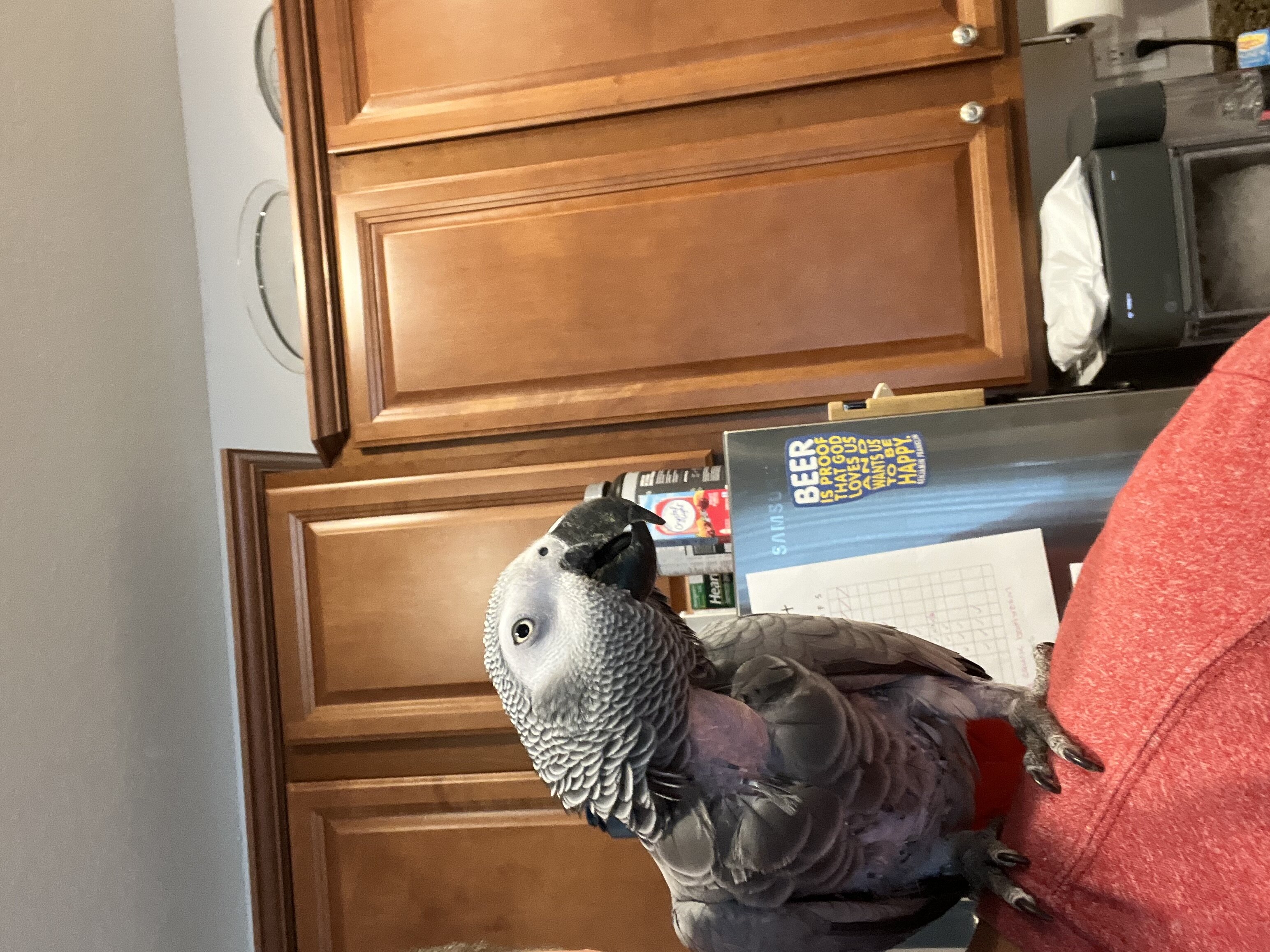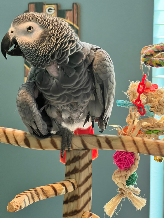 Hey everyone I have a quick question. I recently adopted Rosie a 12 year old rehome from an elderly couple. She is a plucker and we are still working on her diet, I had her at the vet last week for a wellness check. She weighed 469g and the doc said she was in good health other than a cross bite on her beak which I am working with our local bird store I purchased her from on. She hangs with me all day as I work from home either on my desk perch or on a stand, going in her cage a few times a day to eat or if I have an important call. She gets chop, rice, and a protein in the morning and pellets in the afternoon. She is a bit of a picky eater so we are still figuring out what she likes other than cashews and peanuts (hates almonds). When she sits on my desk perch she picks her left leg up and her right wing droops, I have read quite a bit about wing drooping and how it can be a sign of illness. I have not seen any other sign of illness however, ie. weight loss, discharge from nose, lethargy, or plucking (I am sure there are many others). I have attached a picture of the way she sits. I know it could be nothing, but I thought I would ask the question to more experienced owners. Thanks in advance.