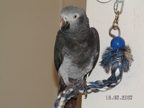 Speaking of the birdie, here's a photo. Hope it comes through. He was dubbed Pegasus by the pet store, where I understand he lived til he was about 15 months old. His previous owner bought him from the pet store and kept him 4 months before passing him on to me. So, he's just over 1-1/2 years old. No, I don't know for sure that he's a he, but I hope to find out once things settle down around here. According to his previous owner he's mechanically inclined -- she said he doesn't like to be in his cage (and who would, sharing it with the cockroaches, ya know?) and he disassembled the door locking mechanism by removing one of the screws that held the eye the bolt fits into. She swears he did it and that he is currently working on the failsafe device -- a little metal tab that swings down to hold the door in place if the bar lock isn't engaged. For my part, I'm inclined to call him Capone -- today he picked up his SS food dish and dumped all the pellets on the floor, then proceeded over and over to bang the dish along the dowels of the back of the chair he was standing on -- like prisoners do with their water cups in the movies!