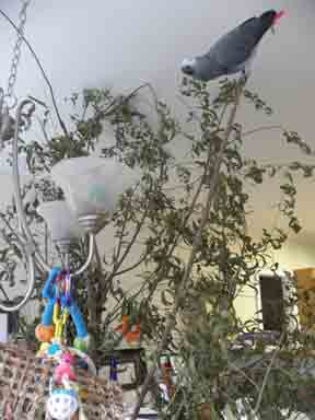 Hi Birdhouse, We have a chandelier hanging with toys, a "tree" with branches, an area in the kitchen with toys, and he has free run on top of the kitchen cabinets. In fact, one of his favorite thing to do is dropping his heavier toys into whatever I am cooking. The tree is actually several branches from a fast-growing willow stuffed into a bucket of sand. He sometimes strips twigs and leaves off. Fun. We rotate the toys, but he just seems to be tired of them. Plus, he has a huge cage filled with toys and a play top. His grip is amazing! I call him "Velcro-Boy." He can land and stick to any surface that has even a little texture. He hangs by one toenail on window frames. On the odd day he feeling particularly invincible he will fly past us and bonk us on the head with his feet. If he could laugh, I know the action would be accompanied by peals of laughter.