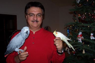 My life partner, Dennis, and I have enjoyed our grey, Pepper, for 12 years. She is a joy and makes us laugh daily. She calls us Daddy Richard and Daddy Dennis, addressing us by name when we enter the house. Pepper enjoys interacting with Charlie, our cockatiel, who we have had for 14 years. She tries to get Charlie to perform tricks on command but so far he will only do these for us. Pepper also tries to get him in trouble by making his "squeaky gate" noises and then says, "Charlie, stop it." We have become really careful what we say to him in front of her. My latest "parrot lover" act was to get a vanity plate for my grew SUV that says "PAIR OT".