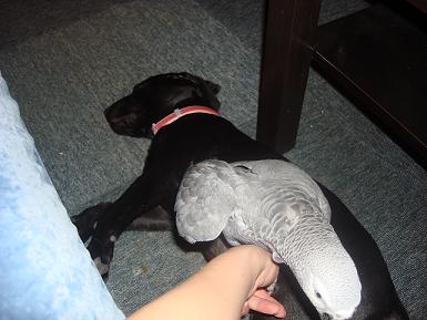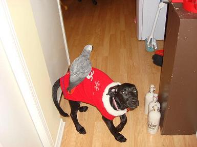 Just wondering if any of you have other pets, and if so, how they interact with your Grey? Or, how do they interact with other animals in general? I am really paranoid, and I guess, better safe than sorry. We have lovebirds, an Indian Ringneck, and a Green cheeked conure. We also have 2 shelter bunnies and a puppy who's a black Lab/Dalmation mix. Zeus (my grey) hates (with a passion) the other birds and will snap at them and try and bite them, so they don't come out EVER at the same time. He doesn't mind the bunnies, but the only other pet he likes is Bella, the dog. He really has taken to her, it's really cute. He will lift his foot up to step up and say very loudly "you wanna step up? YOU WANNA STEP UP???". But he does this to the dog and the dog looks baffled. He will also do his twirly heading off the side of his cage and do the wolf whistle at her, chatter at her, and say BELLA BELLA BELLA. They both seem to like each other. He even rides on her back now. Do your greys get along with other pets, and if so, which ones?? Please post pics, too!