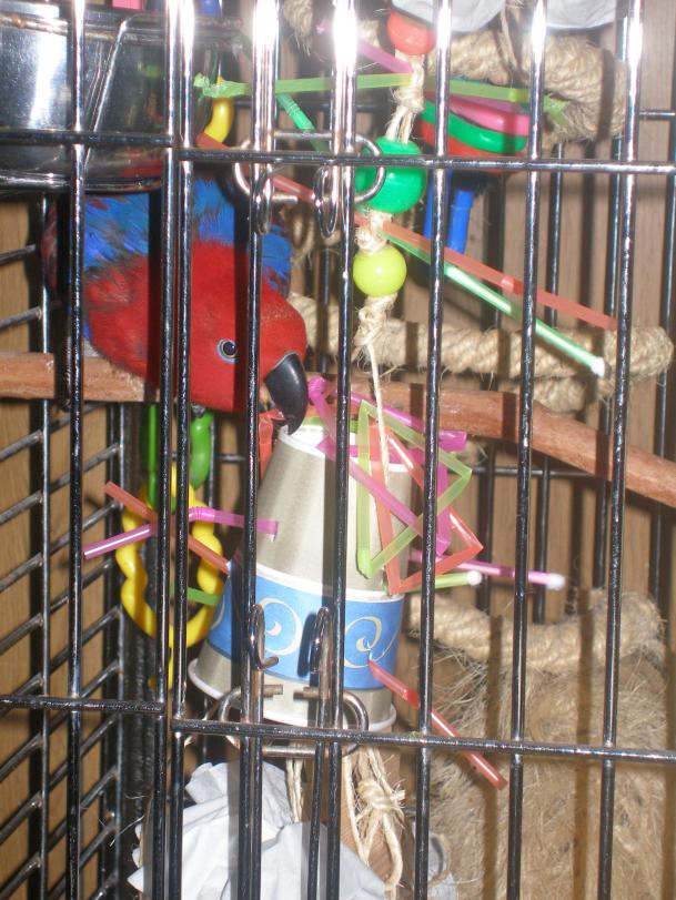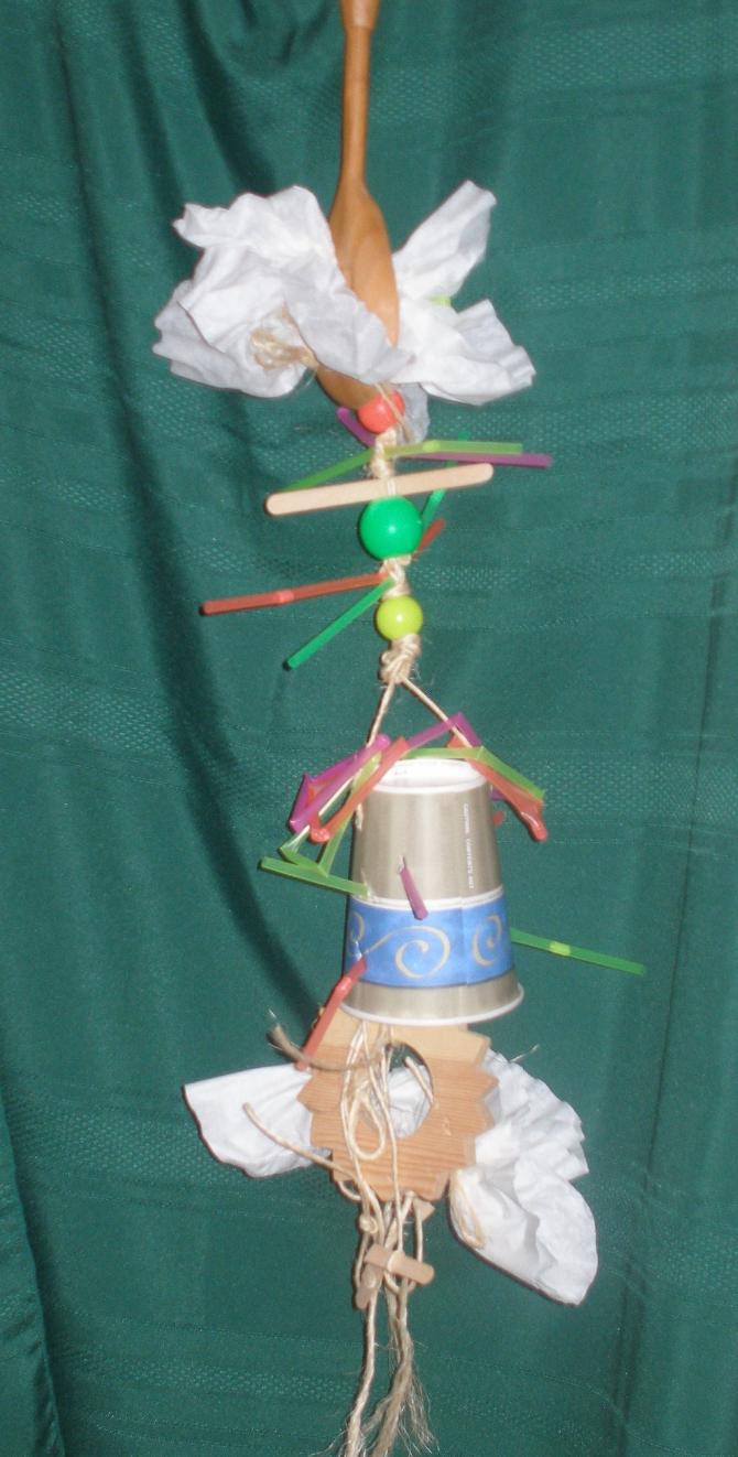 24. This "creation" definitely isn't about looks. It's all about destruction. It might last a couple of days. Whatever survives will be incorporated into the next incarnation. They're all funny looking, but unique & give the birds new stimulus. Toys are constantly changing with little effort or cost. This one doesn't take a lot of cage space, but it's big enough to perch on & long enough to approach from different perches. Coffee filters & cup to shred. Sisal has different knots to untie. It & the popsicle sticks are crunchy. Straws & beads are colors & shapes. The straws move & can be worked loose, become foot toys & easily destroyed. Some also have qtips in them. The spoon & wood shape are for serious destruction. It's also customized to the particular bird's interests. This is for my Eclectus. My Quaker wouldn't like it because there's not enough to beat up & she'd have the knots out in no time. My Grey would be afraid of the florescent colors & size. I can't constantly re-create toys for him because he takes way too long to adjust to anything I hang in the cage. It's often better to just slip something into a paper cup or clean dish for him to find & keep busy. Kura was bouncing when I brought it to the cage. She was on it before I got the link closed. These silly looking "creations" keep everyone at my house busy & happy & save me a fortune.