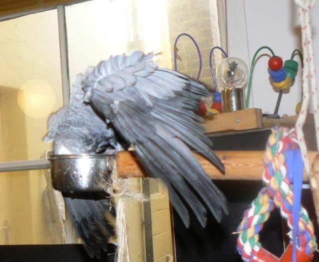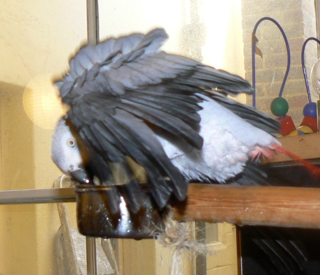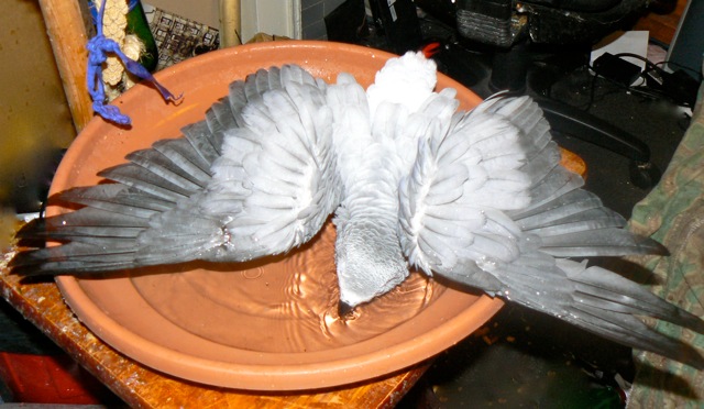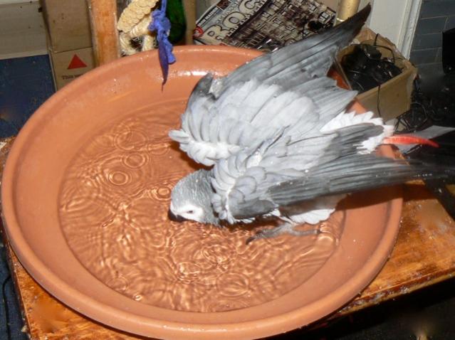 I have been following a bathing discussion on the Avian cognition forum at yahoo groups and I have posted my comment here for the benefit of this forum. Misty is not keen on entering the shower. I have tried but no ..he is definitely not keen! I have a plant mister that I use but even that is not always successful. He has a love hate relationship with the spray bottle. It has its uses though because if he sees me so much as touch it he will normally fly direct to my shoulder because he realises that I am less likely to squirt him there ! I have mentioned this before. However if he is in the mood for a good wetting he will hold his ground and flap like mad as I spray him. He says shower when I use it on him. He also says it when he comes to the bathroom and I turn on a tap (Faucet in American) or operate the shower. Sometimes when he wants a good splash he would try unsuccessfully to bathe in the water bowl on the end of his tee bar. Try as he might he just could not fit in! But I found a solution to the Grey sized bath problem. I bought a large plant pot dish and filled it with water. As soon as he saw hit he said "Showa" and jumped in. It still only gets his underside wet but that is the part I could never get with the mister. Steve n Misty
