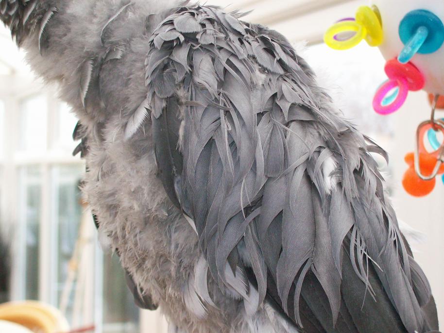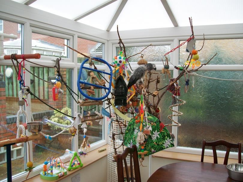 hi just read the thread and i have the same problem with monty. he is two & half years old but has just started shredding his feathers, but unlike primusDCE monty has done all his back feathers and chest feathers too ( will try an add a pic) i think it may have started 6-7 months ago when he clipped his wing whilst flying from the lounge to the conservatory, he broke some his wing feathers half way across and started to chew them off, i think this has just escalated into him chewing every where... i do spray him but he growls and doesnt like it so maybe dont do it as oftern as i should as i dont want to upset him even more. he is out of his cage all day until bed time and has so may toys and trees to keep him amused ( i have enclosed a pic) but the pic only shows a tiny protion of what he has to keep him entertained. i would love any suggestions as to what to do as the amount of time that has passed since him catching his wing and he is still chewing. the only feathers on his chest & back is the soft downy stuff and you can see through this. he plays and talks loads and his behaviour and diet are still the same. he doesnt pluck the feathers out he chews them and shreds them.... thanks in advance diane