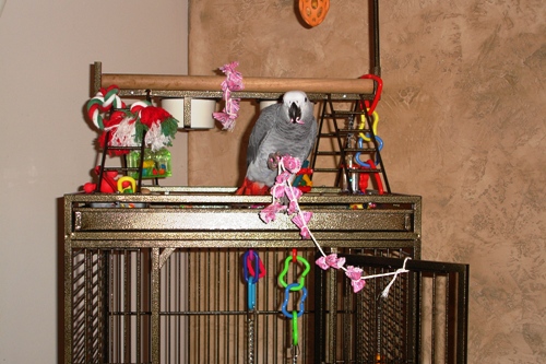 This is a picture of the cup cake wrapper toy- just tie a treat (I use almonds, raisins, or a sunflower seed) in each cup cake wrapper then tie it on a string, Mika pulls it up and destroys the wrapper to find the treat:laugh: Keeps him busy and out of trouble - well keeps him busy anyway. Carolyn & Mika