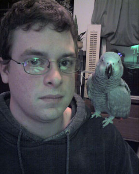 Doorknob, the Congo, was originally going to be named Dorian the Grey. But I was hung over one day and started calling him Doorknob and it stuck. Tatters, the Timneh, was a plucker when we bought him. My wife was on her way to get him and she was listening to that song....'I'm in shatters...', and so she named him Tatters.