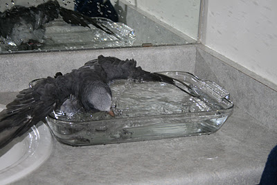 This is Charlie's favorite way to bathe. Whenever we see him trying to take a bath in his water dish or my water glass, I know it's time to get out the bath. He loves it. He gets all riled up. All of a sudden he'll jet out of the water and fly up to the shower or towel rod, sit for a minute, then bolt back to his bath. He chatters away the whole time. He doesn't get completely drenched on his back though this way, so every so often we'll bring him into the shower for a good soak. He doesn't quite enjoy this though. In the shower he does everything to escape, and when I make that impossible, he just sits and pouts. Anyway, maybe your fid would prefer bathing at her own ease like Charlie rather than being forced. We used to have a shallower dish, and when we switched to this one, he was afraid of it for a while, but he got used to it.