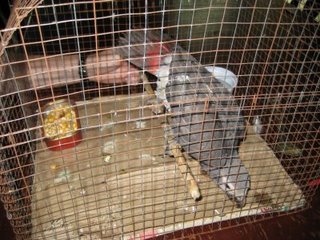 I just finished posting a bunch of pictures on my blog, so thought I'd continue on that roll here. Here's charlie checking out his new cage. We bought some wire screen when we were in the capital and had a carpenter from our town make a bamboo frame and table to put it on. Resources are limited here, but I was impressed what we could have made. Cage and table cost about $15 all together. Charlie enjoys destroying the bamboo. I was going to try to train him not to, but I figure its his and he can do whatever he likes with it. It's just like one big toy to him!:lol: