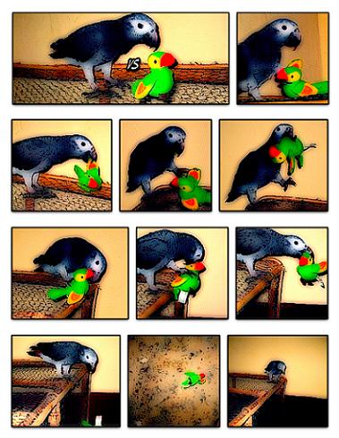 I guess charlie is a little territorial. He can't stand having this stuffed bird on his cage. He was afraid of it at first, then enjoyed taking his frustration out on it by gnawing on his head. Now whever he sees that its back on the cage, he just walks over to it, picks it up, and summarily drops it over the edge. any suggestions for captioning?