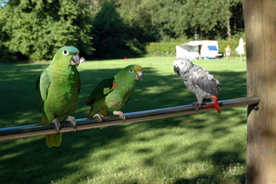 Yes,Tabu was very cute and she knew it. She doesn't live here anymore, but I'm working on her story in a Blog. All I can say at this moment, is, that people thought she was still a chick and they all said that she was soooo cute, so she got attention by clipping her feathers More later, it's a rather complicated story. Here's another pic of camping with the parrots. They're waiting for the shower!