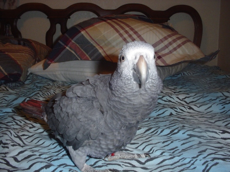 I have had him for 2 months right now, Trigger and the 'tiels (Yumi, Toby, Fuku {Japanese for fourtune} and Oni) do get along ok but Trigger is fasinated by their tail feathers and just has to grab them.