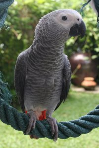 When he's not with me indoors, he spends most of his day on our garden swing, as you can see I've turned it into a rather large playstand! I got the large green rope from a fishing and boating supply store and twisted it round the legs of the swing for Olly to climb up and down on. (I made a little swing for him with the leftover length, thanks to the inspiration from other members' photos on this forum!) He is free to climb down onto the grass, and I think it satisfies his need to 'forage', which he does for a couple of hours each day (I scatter seeds for him).