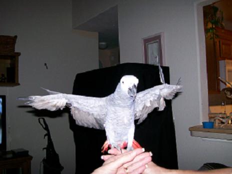 We started out with our lil grey Pippin 2 years ago. We got him as a little man, looking like a dinosaur:laugh:. He was lovingly hand fed and would cuddle with me and mom. Several months go by and Pippin is finding his new found freedom of fledging. He is finding out that these little nubs that are on his sides now contain feathers that he can actually fly with. It's a wonderful time..lil Pip getting bigger and bigger and testing his new found flight freedom out. Then it's time for his first wing clip. Mom brings Pip to the local bird professional and he gets a modified trim. Things are great! Pip can still fly but does not gain enough speed to hurt himself for those late turns into the blinds. Time goes on and Pip is still the loving cuddly grey and his flights are growing out again. Off mom and pip go to the local bird professional..oh oh! The person that usually is there is not and pip gets his wings trimmed by another. Oh no..Pip's wings are not clipped modified but snipped completely. This is where the problems begin. Pip comes home and discovers that when he jumps off of his house and flaps his wings he falls to the ground..OUCH! Me and Mom realize the error of the clip and try to coach Pip through this trying time. Pip will have nothing to do with coaching. He seems angry..I guess I would be too if the thing my arms were made for was suddenly not there anymore! He becomes increasingly reluctant to come out of his sleeping house in the morning and his day house in the evening. Where mom and I used to offer our hands and say step up to have Pip happily step up we now face a Pip who leans back and screams at us. Pip now has flight feathers constantly breaking from his flapping and seems to be overgrooming the flights that are trying to come in. We can not figure out how to help him grow his flights back. It has been a year and he still has not gotten any flight ability back. He always has little feathers coming out but he seems to break them before they come in fully. Can anybody help!!