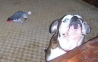 Kiwi is an AG inherited by a friend of a friend who kept him in a spare room for 10 years because Kiwi didn't exactly like the guy. He was plucked, dull and his tail was deformed. In 3 months of daily baths and never being caged he is the most amusing boy! He laughs all day, and is in love with my Blue front girl UNTILL Chopper my Bulldog enters the room. Wherever he is he runs over to chopper to play with his tail or his nails. Chopper is a little uncomfortable with it but would never hurt Kiwi but sometimes Chopper just has to leave the room, it's too much love for him. I live in an old farm house with doors and last night I went out and Kiwi walked into the other room to sit on the sofa with Chopper to watch TV!