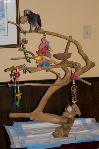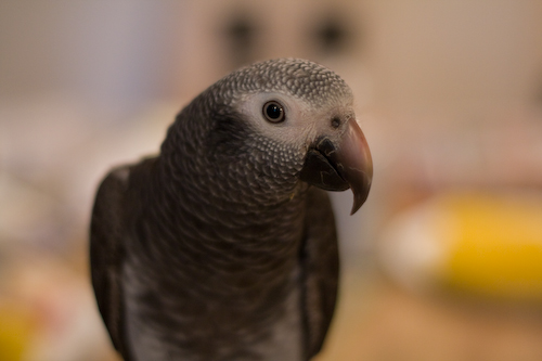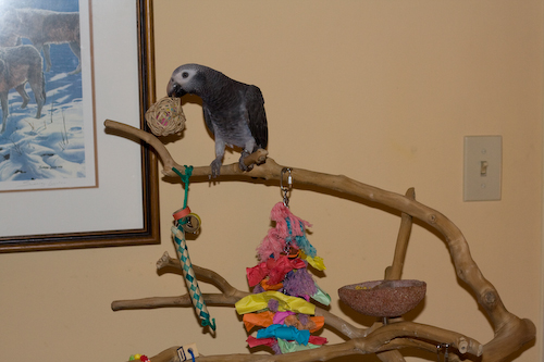 Hello again everyone. I've got a little update on Darwin here and I'll try not to make it too long! I know I tend to get mushy and say that I love her so much and I can't imagine life without her, but honestly - I have never loved a pet this much and have never felt such a connection to an animal. I adore all my pets but Darwin is more like a child to me and I would do anything for her. Anyway, on to the update! She is almost 10 months old now and I can't believe how time has flown. She is growing up into a very sweet, loving and intelligent Timneh and get more independent and confident each day. Since I've been bringing her to work and she's gotten lots of attention from many, many different bird-lovers, she is an absolute socialite and loves meeting new people. My boss has taught her to shake hands before stepping up onto someone and she does this every time - it's very funny. She can now say "HI! How are you?", "Hello Darwin" and "Wookywooky". She can also make a duck's quack and a monkey noise, usually on cue. She mimics the phone and microwave beeps among many other sound effects - she seems to enjoy making up whistles and mimicking sounds more than saying words! She'll step up onto anyone but loves my Mom and me the best. We're the only ones who can pet her, and I can touch her anywhere without so much as a peep. She loves head scratches and foraging and banging bells. She seems happy and is healthy - always making noises, swinging upside down, and her favourite thing about the morning is getting her veggies! She also comes into the shower daily and lets me drench her whenever I want (usually 3x/week). She also adores taking baths on the kitchen table in a baking dish, and I have a video of this - it's hilarious - and will try to share it soon! Anyway, I'll stop talking now and will get on with the photos!